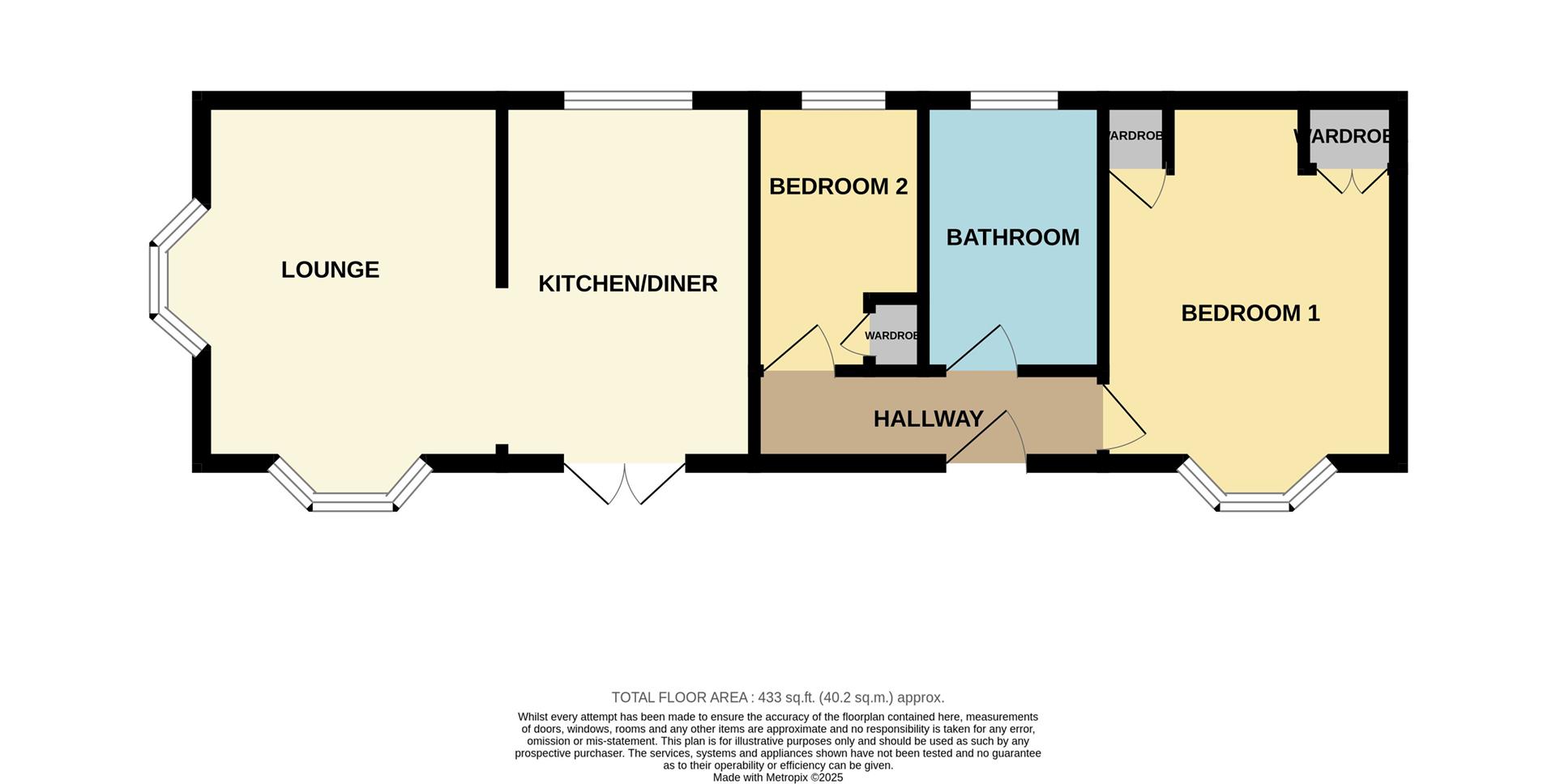 Accommodation comprises hallway, lounge with bow windows, fitted kitchen, bedroom one, bedroom two and the bathroom with a white suite.