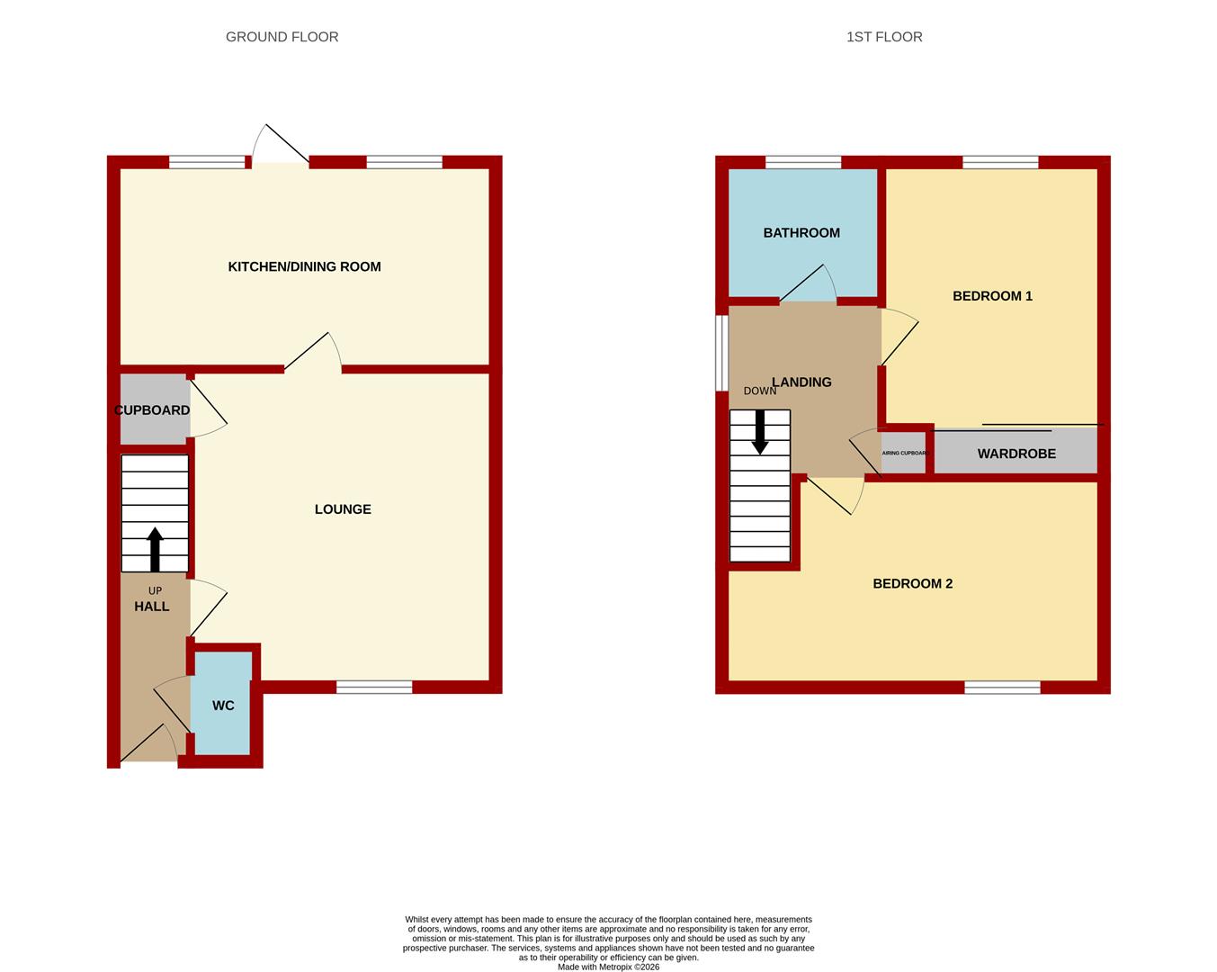 The property comprises: ENTRANCE HALL, CLOAKROOM, LOUNGE, and KITCHEN / DINING ROOM to the ground floor, with TWO DOUBLE BEDROOMS and a FAMILY BATHROOM to the first floor.