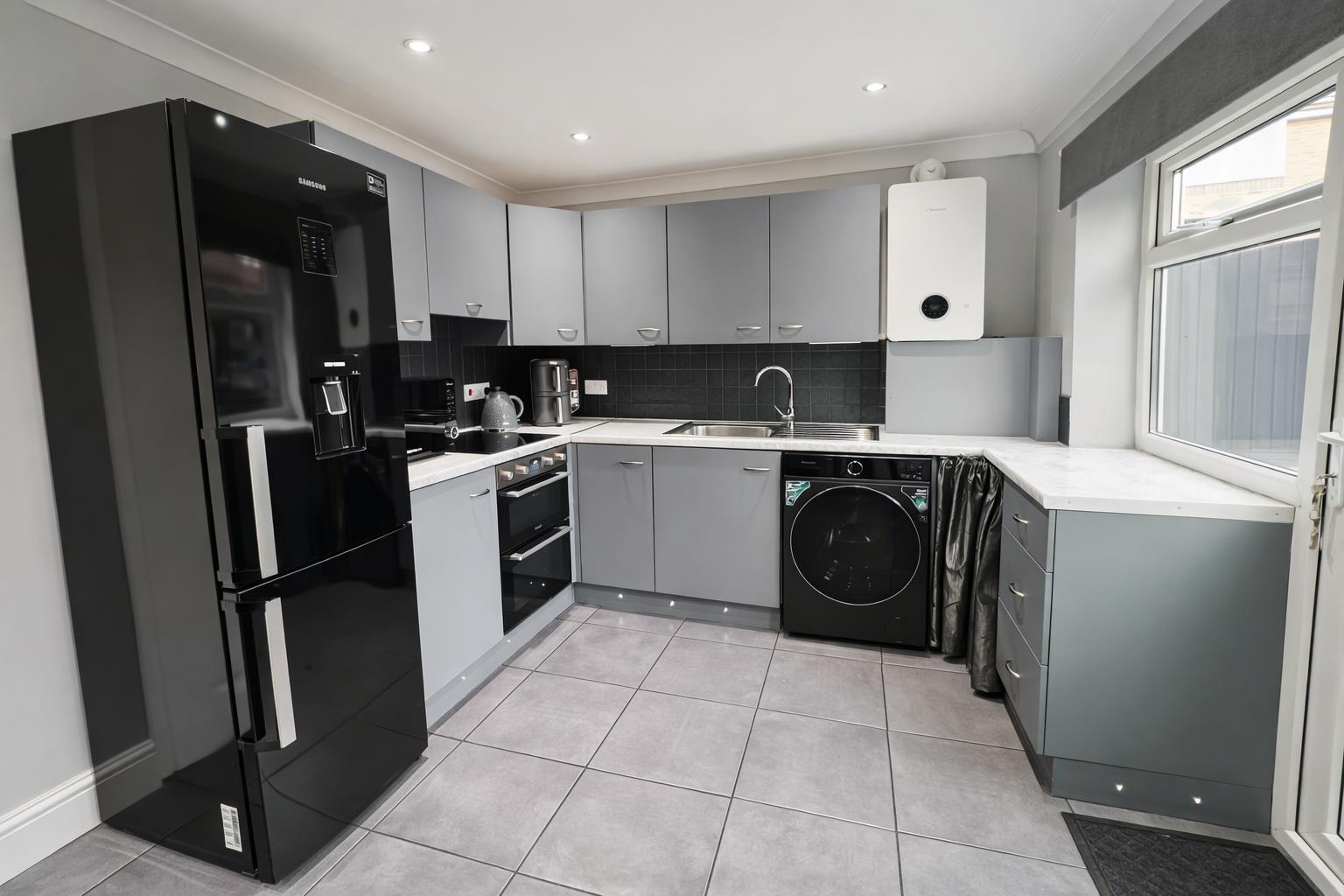 Kitchen/Diner - 5.05m x 2.74m (16'07 x 9'00) - Kitchen- Single bowl, single drainer stainless steel sink unit, monobloc mixer tap over, rolled edge worktops, range of base and wall mounted units, tiled surrounds, inset ceiling spots, coving, four-ring electric hob with double electric oven beneath, filter hood above, wall mounted gas fired central heating and domestic hot water boiler, space and plumbing for automatic washing machine, space for fridge/freezer, tiled flooring, low level cupboard lighting, rear aspect upvc double glazed window overlooking the rear garden, obscure glazed panel door opening onto the garden.