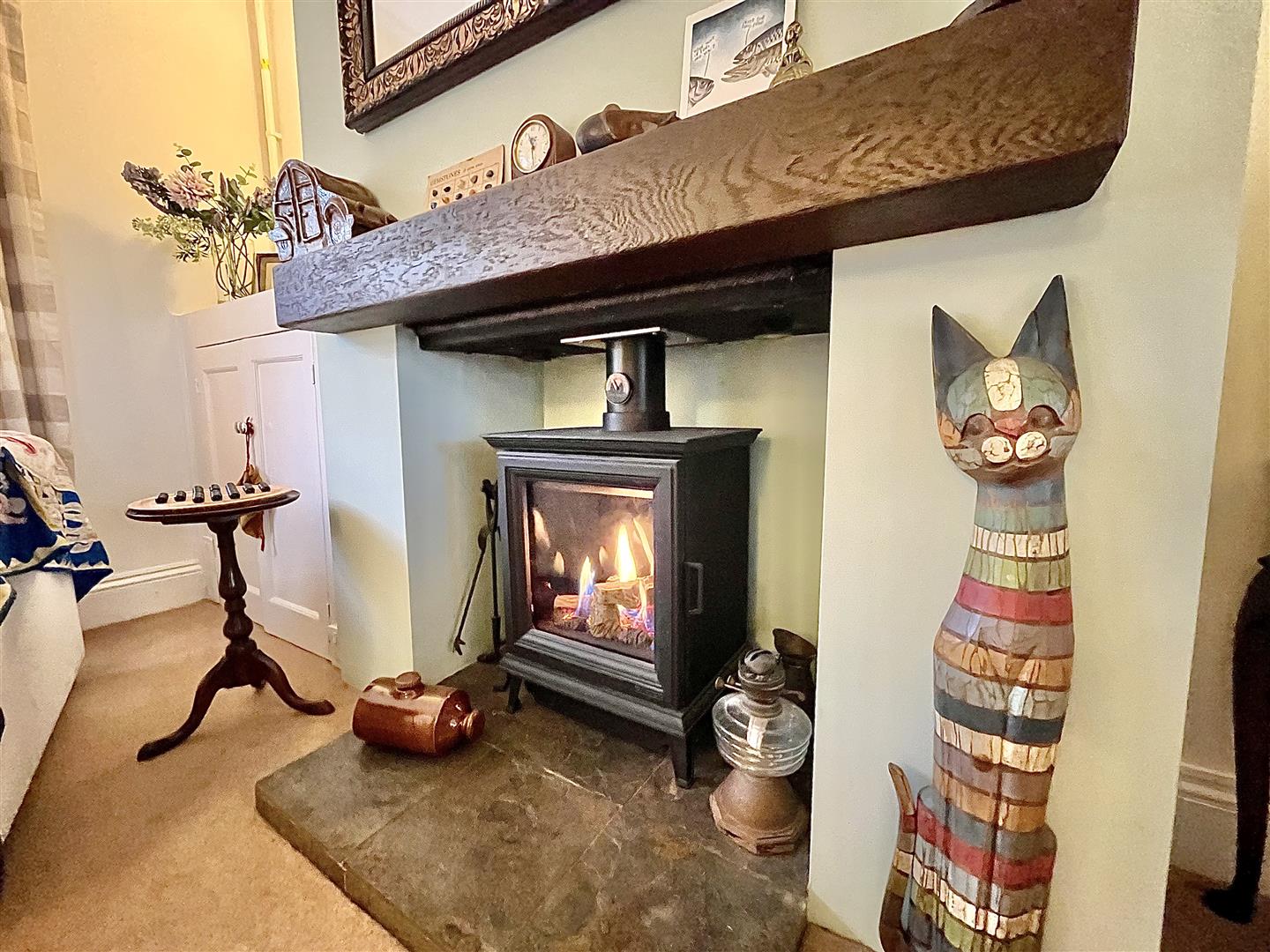 Lounge/Diner - 6.58m x 3.66m (21'07 x 12'00) - A bright and spacious room ideal for relaxing and dining with attractive feature fireplace having a gas 'wood burning stove' effect fire sat on a stone hearth. Alcove with built in cupboard, radiators, part tiled floor, front and rear aspect windows, tilt and turn window and door to;