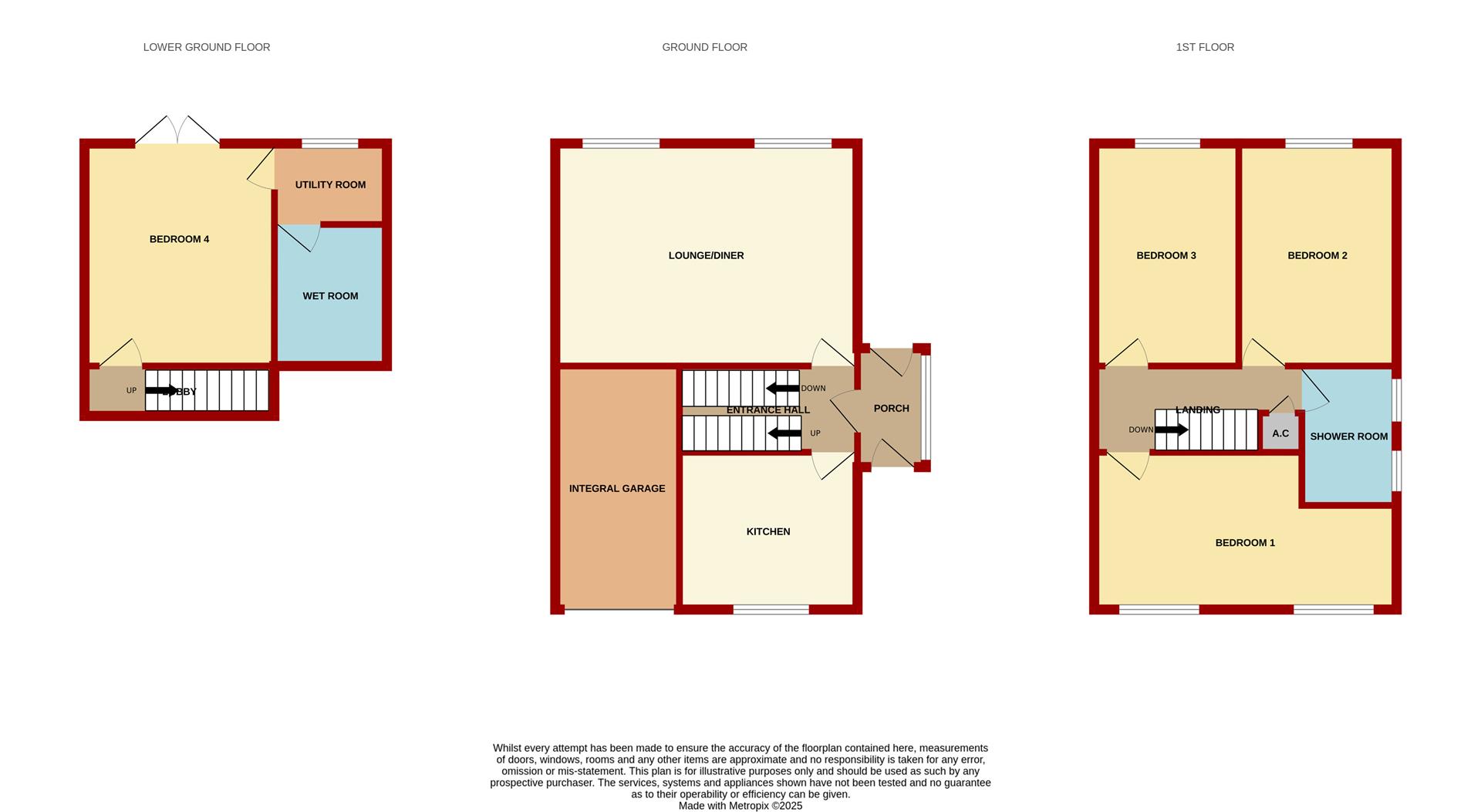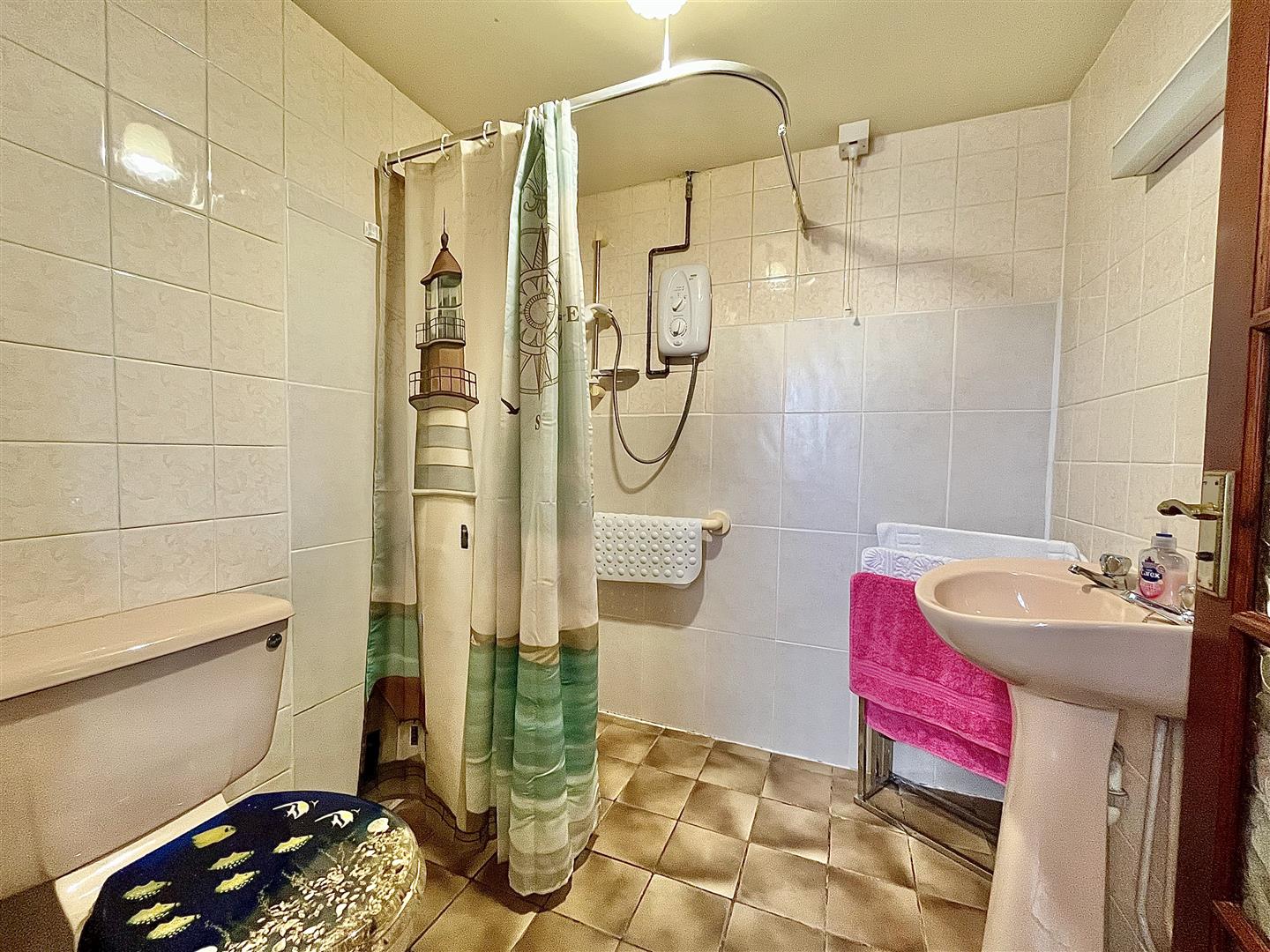 Wet Room - Electric shower, close coupled w.c, pedestal washbasin, tiled floor and walls, extractor.