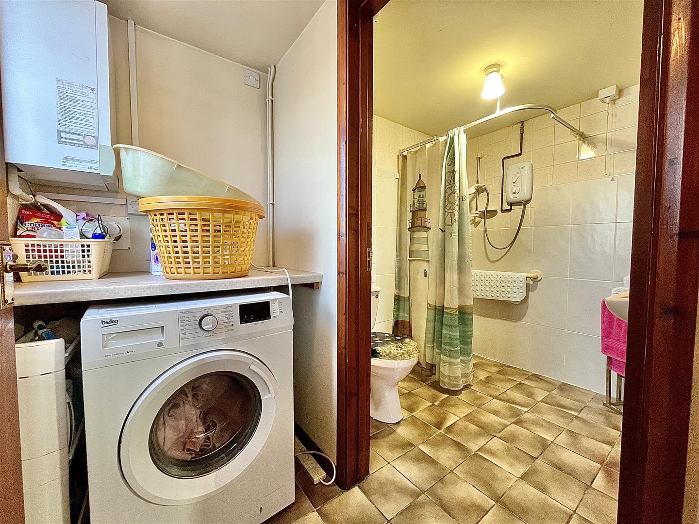 Utility - Fitted worktop with space and plumbing below for a washing machine, wall mounted gas-fired central heating boiler, tiled floor, rear aspect window, door leads into;