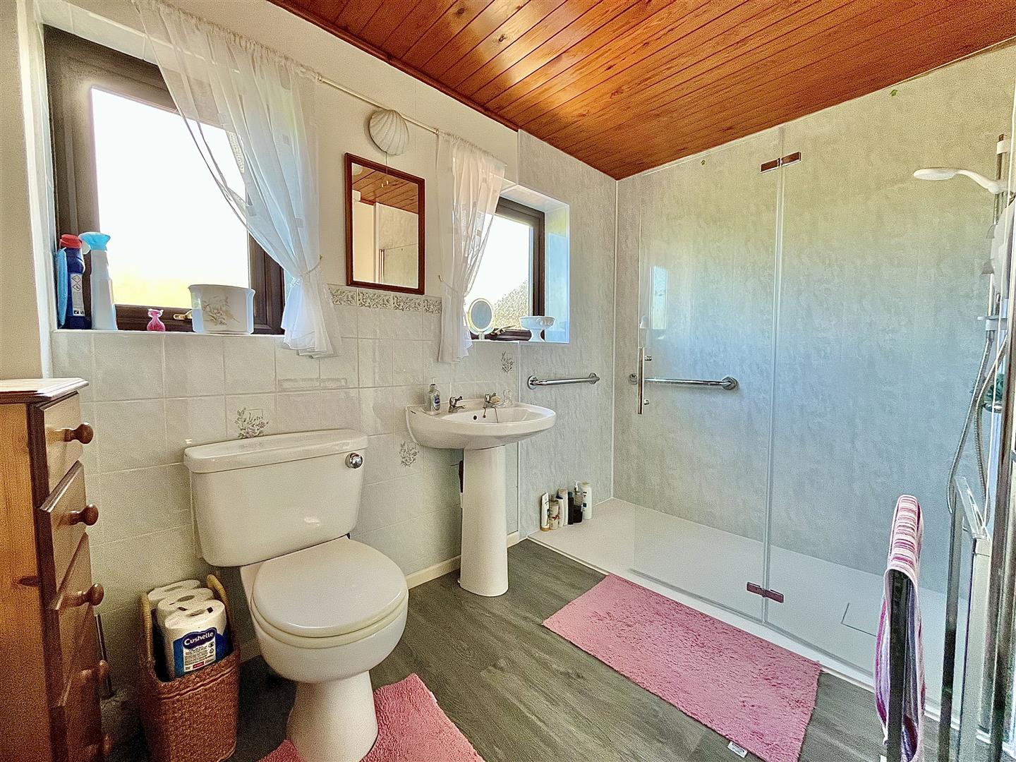 Shower Room - 3.02m x 1.83m (9'11 x 6'00) - A modern suite comprising a double width walk in electric shower with wet board surround, close coupled w.c and pedestal washbasin, radiator, two obscured side aspect windows.