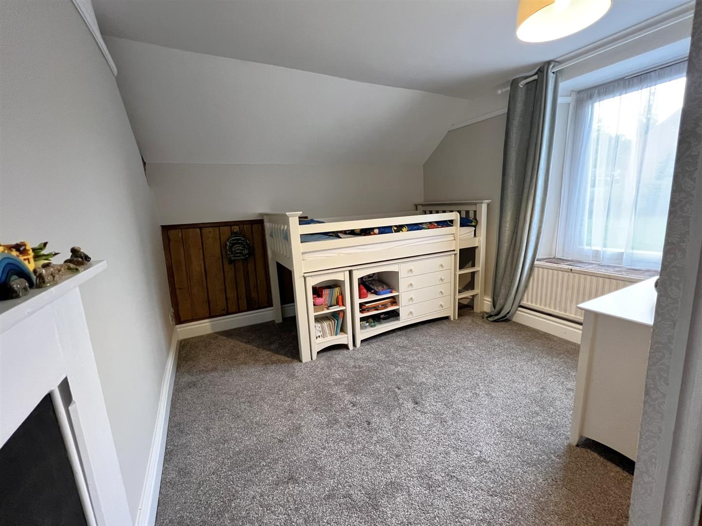 Bedroom Three - 3.89m max x 3.02m (12'09 max x 9'11) - Ceiling light, mains wired smoke alarm system, picture rail, double radiator, power points, pair of door giving access to built-in wardrobe with hanging rail, feature fireplace surround, front aspect upvc double glazed window with tiled ledge overlooking the Ruspidge Green, wooden plank door giving access into: