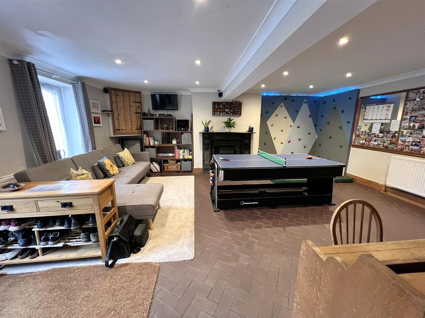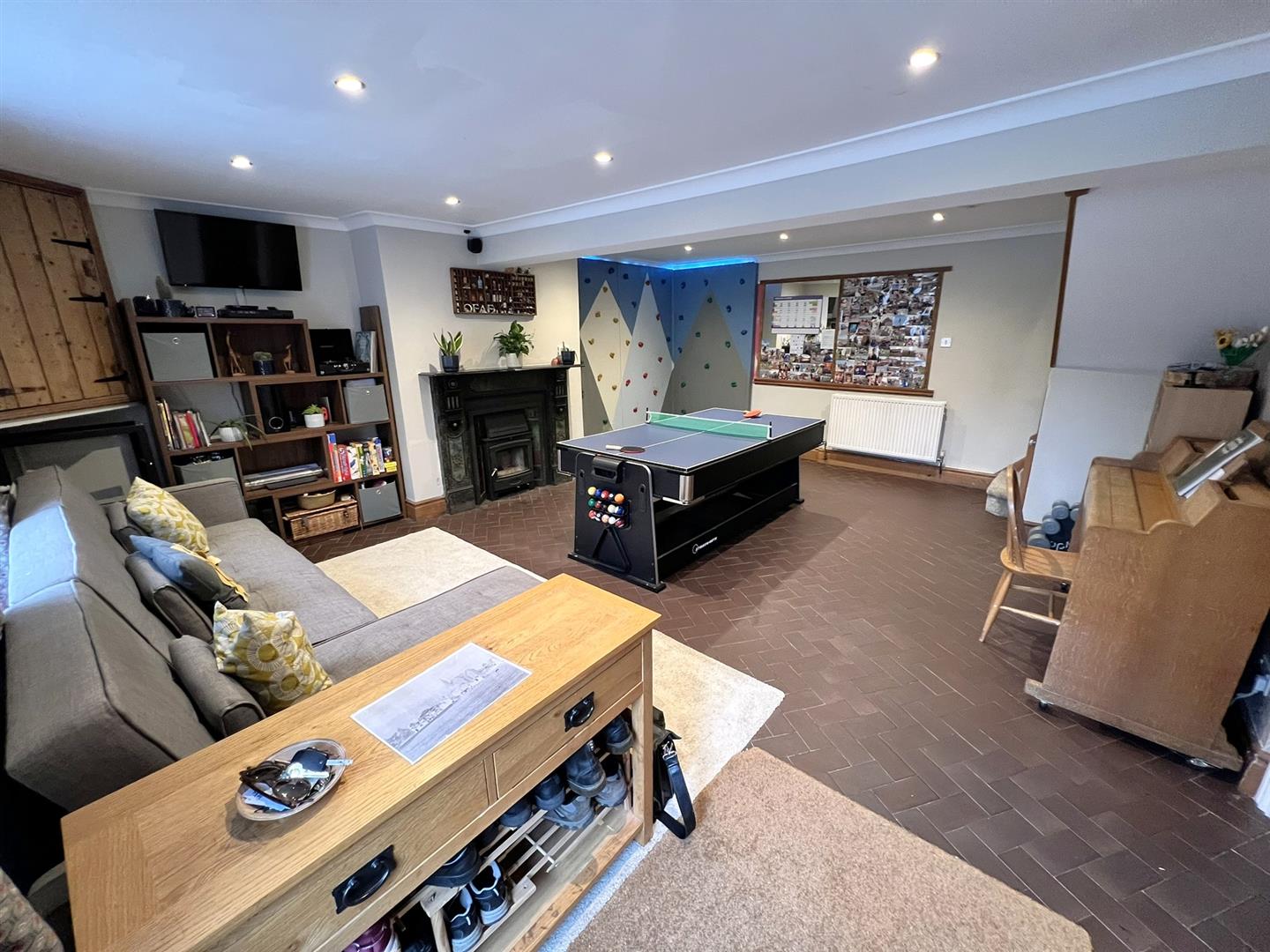 Family/Games Room - 6.20m x 5.16m (20'04 x 16'11) - Feature slate fireplace with multifuel stove inset, alcoves to either side, wall mounted corner cupboard housing the electrical consumer unit, solar panel unit and gas meter, inset ceiling spots, coving, stairs leading to the first floor, understairs storage cupboard, three double radiators, exposed timber skirting boards, power points, tiled flooring, dimmer switch, front aspect upvc double glazed window, doors giving access into: