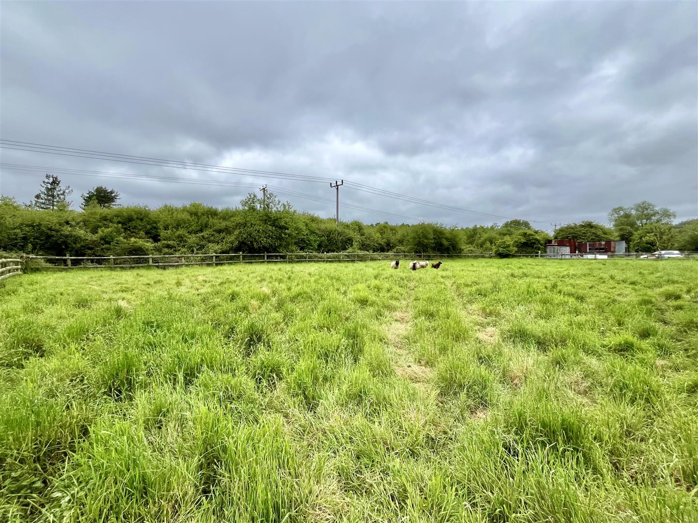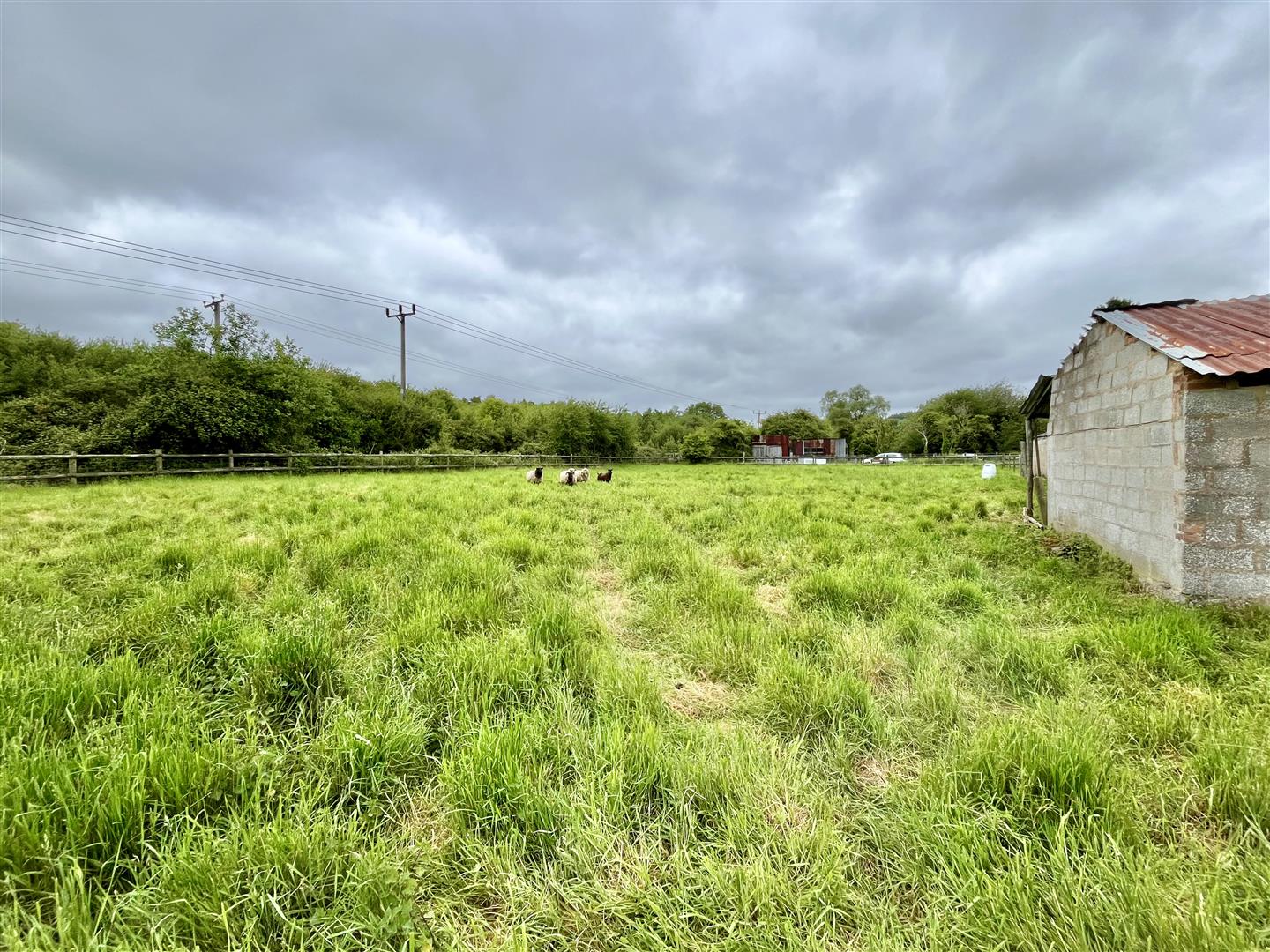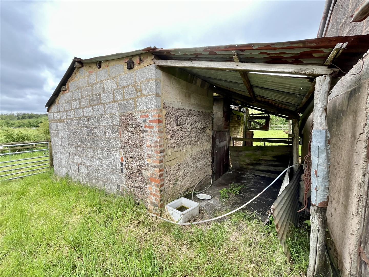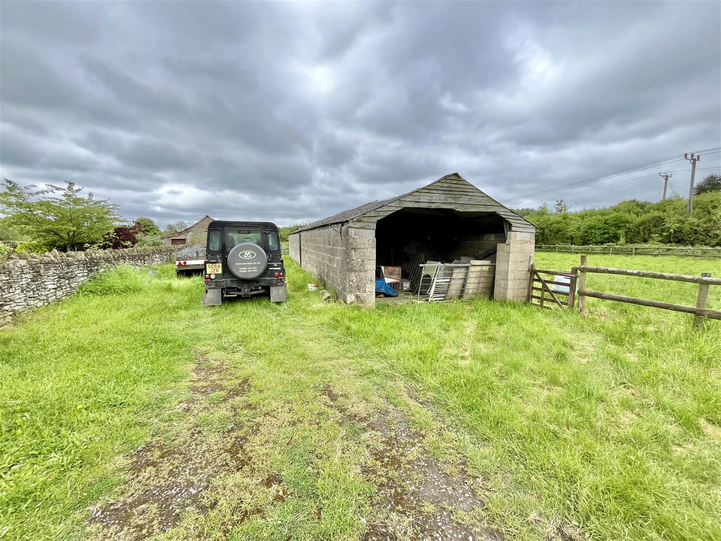 The level L shaped paddock is securely enclosed and is currently used for keeping goats. At the end of the paddock is a large hay barn and there is a stone barn that both require some work.
