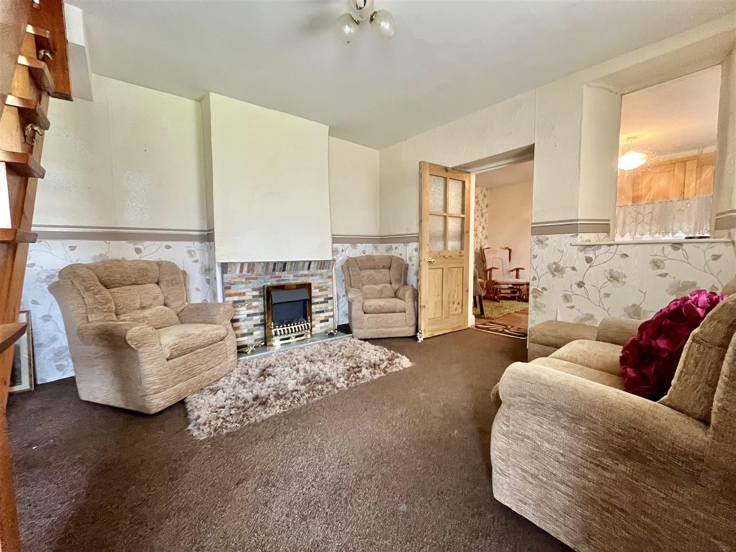 Lounge - 3.99m x 3.63m (13'01 x 11'11) - Feature fireplace with tiled hearth, radiator, window and door to rear aspect leading out to the garden, open tread staircase to first floor, door leads into;