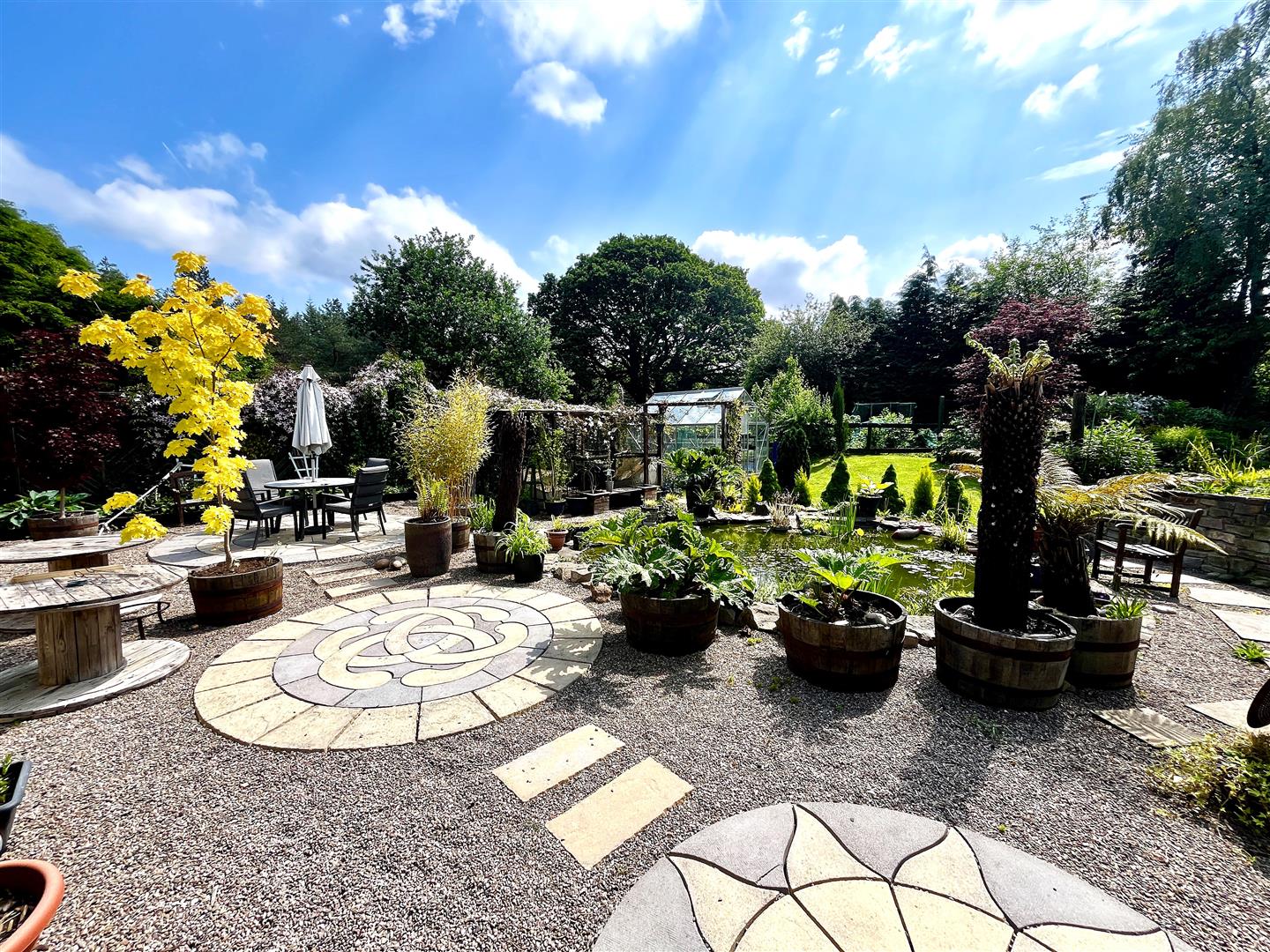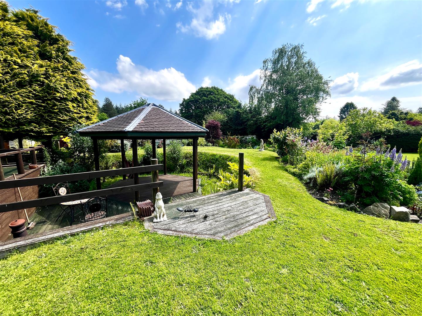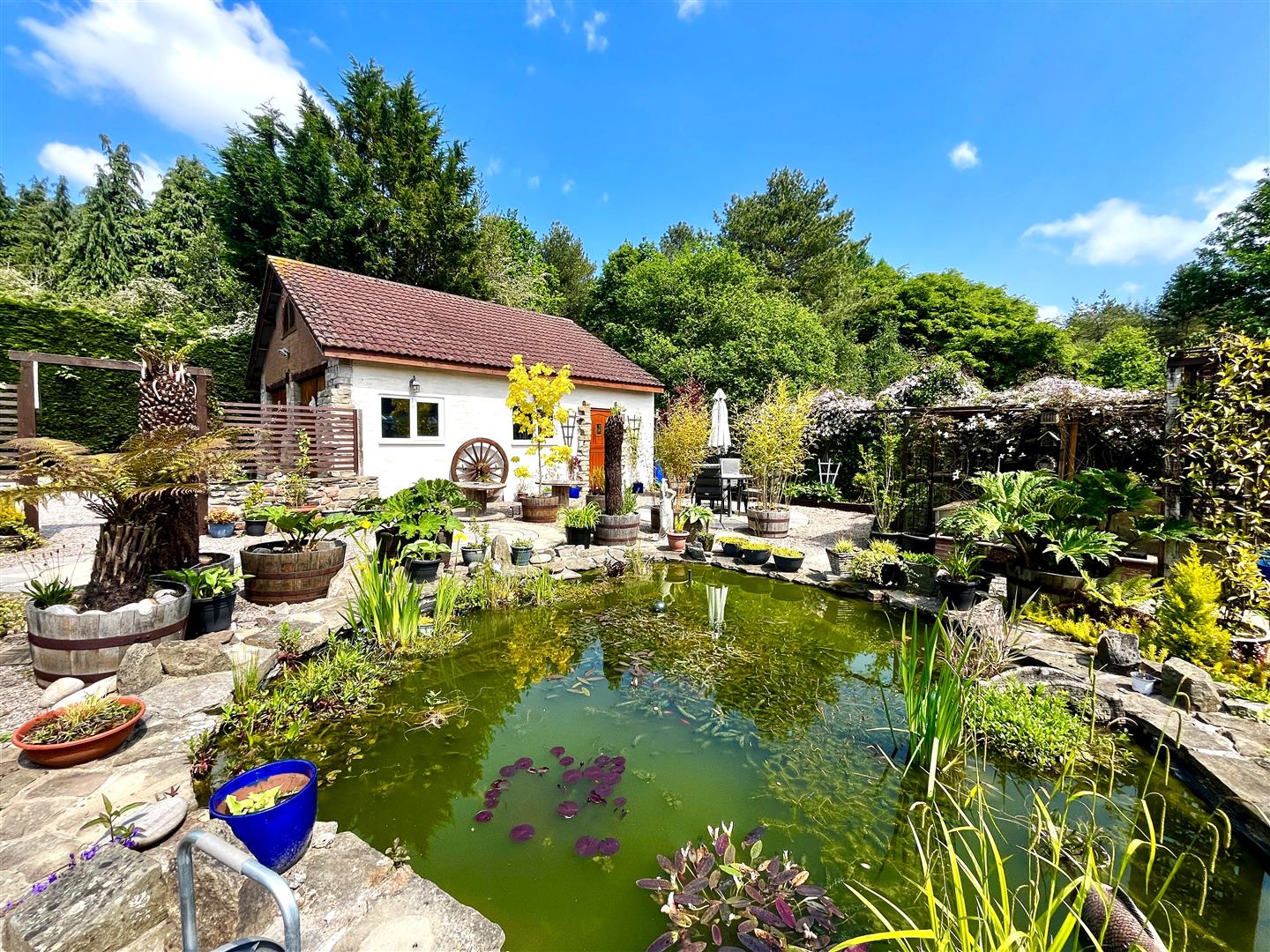 The rear of the property has been beautifully landscaped consisting of a stone chipping and patioed section a the top perfect for entertaining, leading into a vast laid to lawn area with a centrepiece area which has steps down onto wooden decking with feature pergola and raised decked seating area. To the bottom of the garden there is an area perfect for planting and gardening consisting of raised flower beds/vegetable patches and a green house, fish pond, chicken coop and two further stone chipping seating areas, gate providing access to woodland, LPG gas tank and parking with turning circle connecting to the front driveway providing access to the garage.