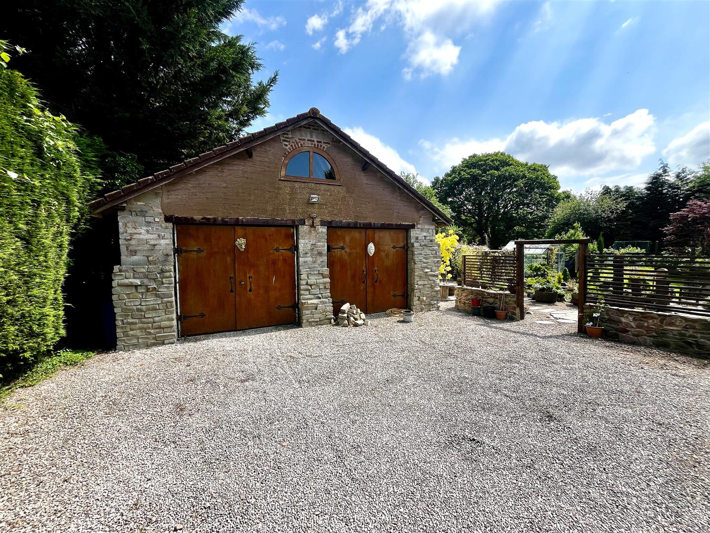 Outside - The house is accessed via wooden double gates onto the stone chipping driveway providing ample parking for several cars. There is a laid to lawn area surrounded by floral borders and fencing with further pathway leading up to the front door and side access on either side of the property leading to the rear garden.