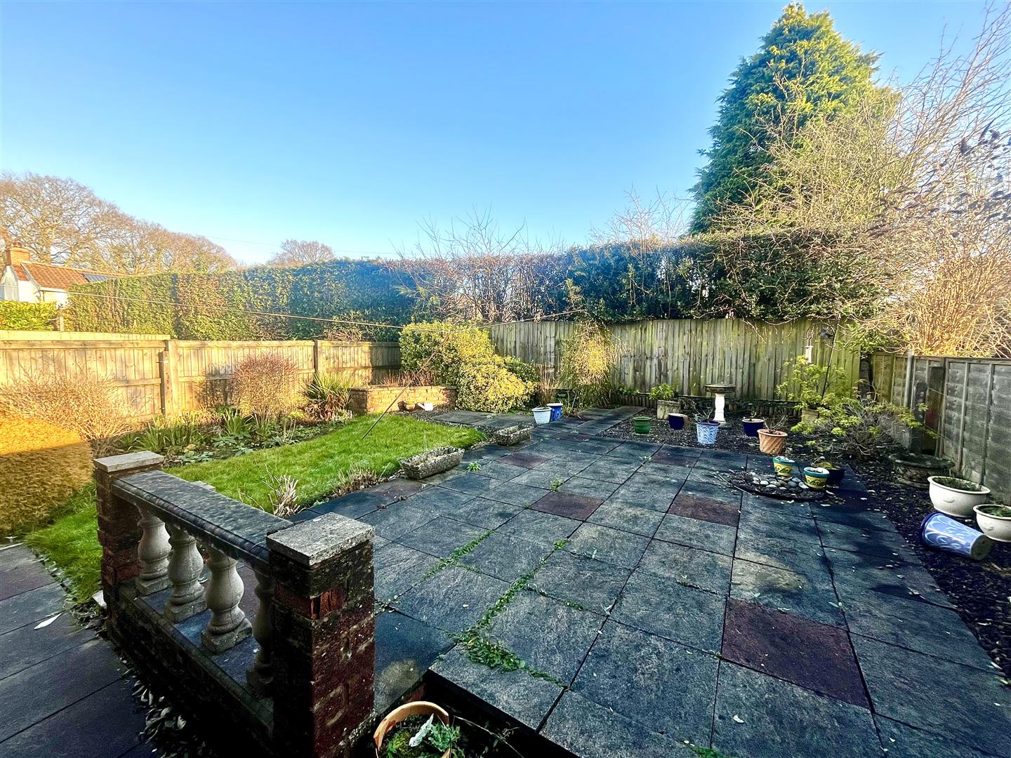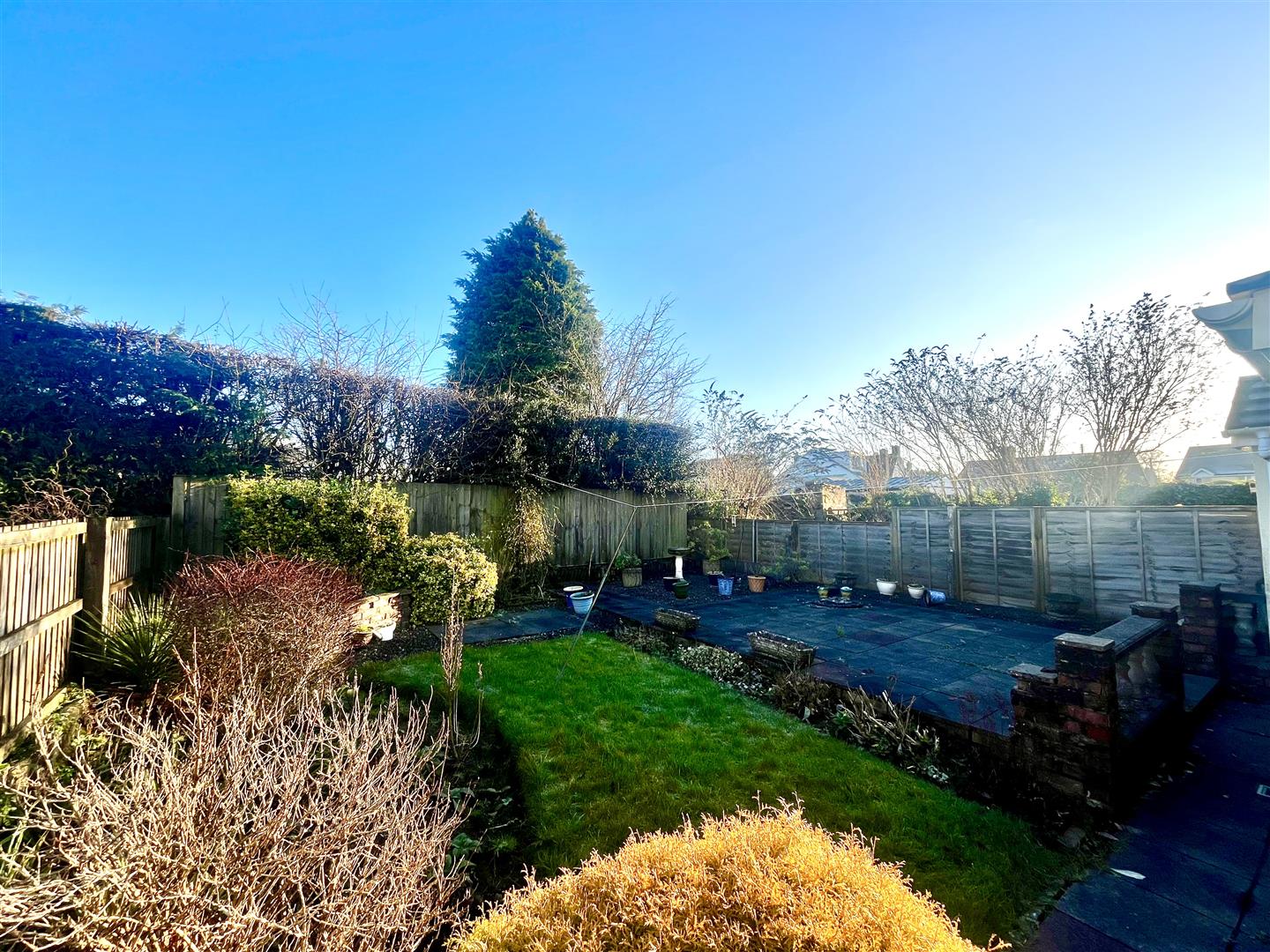 There is a large side access which has a garden shed and a gate leading to the rear garden which has a small laid to lawn area, several flower boarders, large patio slabbed area, all surrounded by fencing.