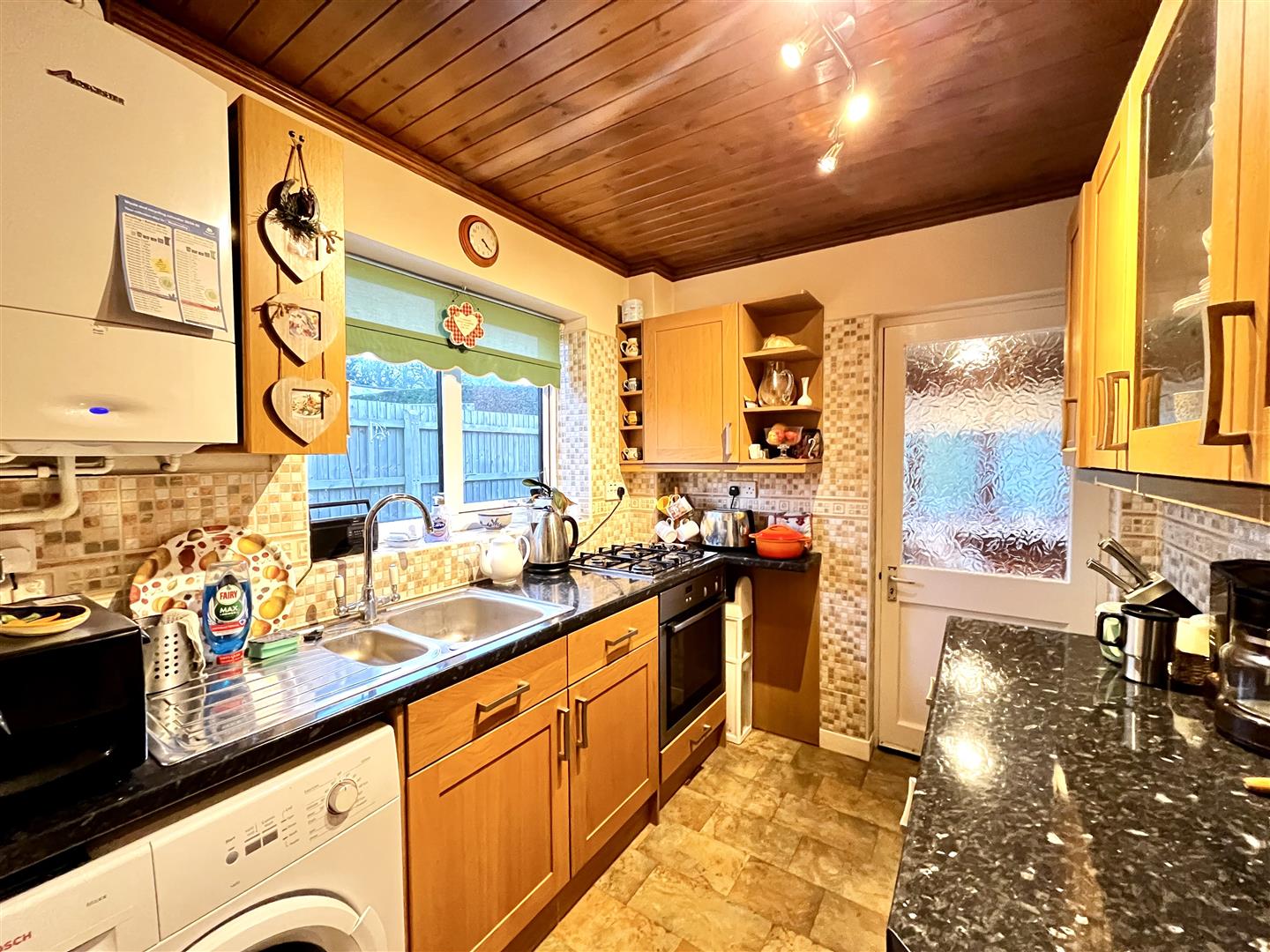 Kitchen - 2.06m x 3.45m (6'09 x 11'04) - Range of wall, drawer and base mounted units, side aspect double glazed upvc window, built in oven, four gas ring hob, space for washing machine, stainless steel one and a half bowl single drainer sink unit with tap over, power points, Worcester combination boiler, rear aspect wooden door giving access into Sun Room, door which gives access into cupboard/under stairs larder which has space for an under counter fridge fridge freezer, side aspect single glazed frosted wooden window, power points, fuse box. Door giving access into: