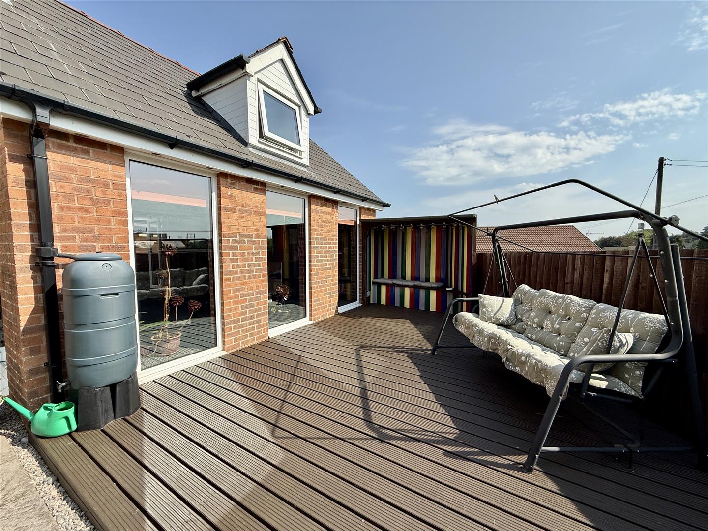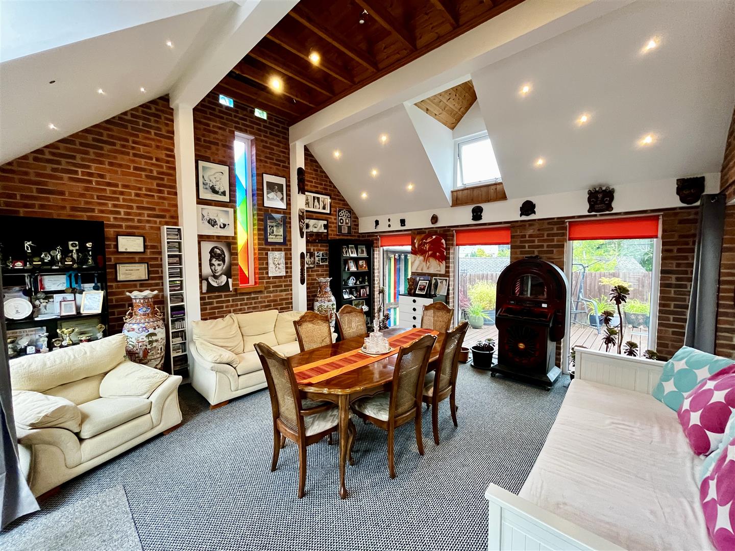 Entertainment Room - 4.95m x 4.88m (16'03 x 16'00) - Three rear and two front aspect double glazed upvc windows, side aspect stain glass window, patio doors giving access out to the front courtyard area, rear and front aspect double glazed upvc dormer windows, large vaulted ceiling, side aspect double glazed upvc door which gives access out to the rear garden, radiator, power points.