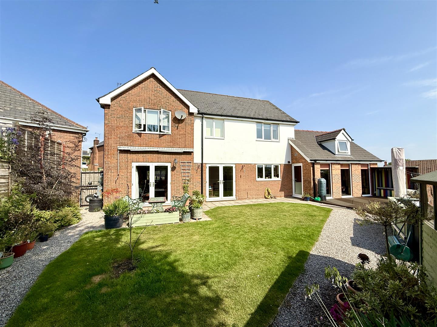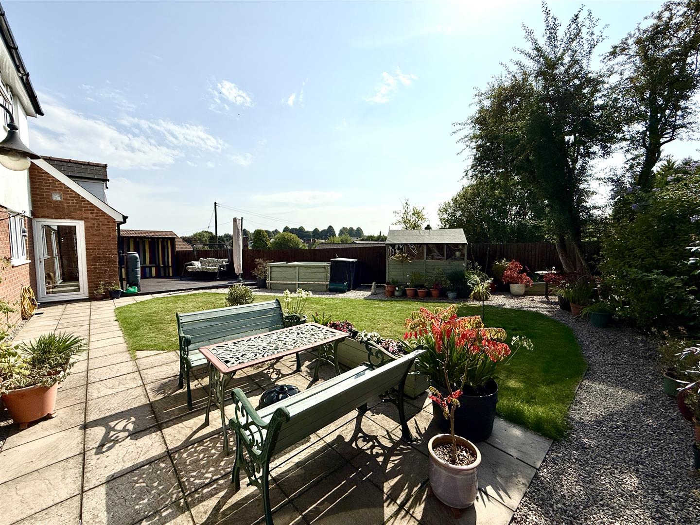 Rear Garden - Lovely patio seating area, decking area with several seating areas within, gravelled area with a garden shed, raised vegetable plots.