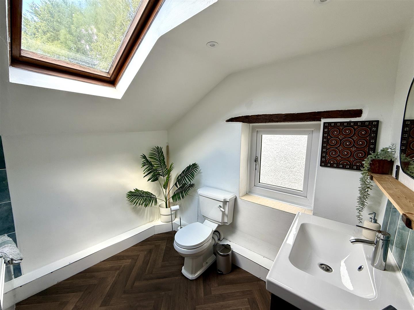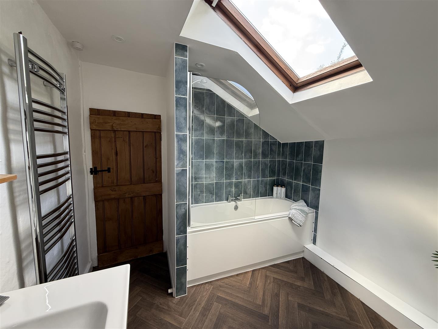 Bathroom - 2.51m x 2.54m (8'03 x 8'04) - Rear aspect double glazed upvc wooden Velux window, side aspect double glazed upvc window, modern panelled bath with bath taps over and shower attachment above, extractor fan, inset ceiling spotlights, heated towel rail, large vanity wash hand basin unit with mixer tap over.