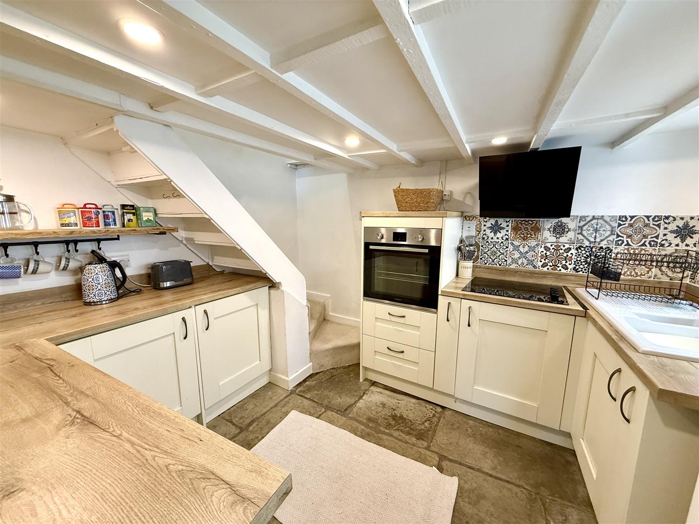 Kitchen - 2.97m x 2.82m (9'09 x 9'03) - Range of wall, drawer and base mounted units, side aspect double glazed upvc stable door which gives access to steps leading to a pathway to a rear garden, built in oven, hot and extractor fan, porcelain one and a half bowl drainer unit with mixer tap over, inset ceiling spotlights, radiator, power points, stairs to first floor landing.