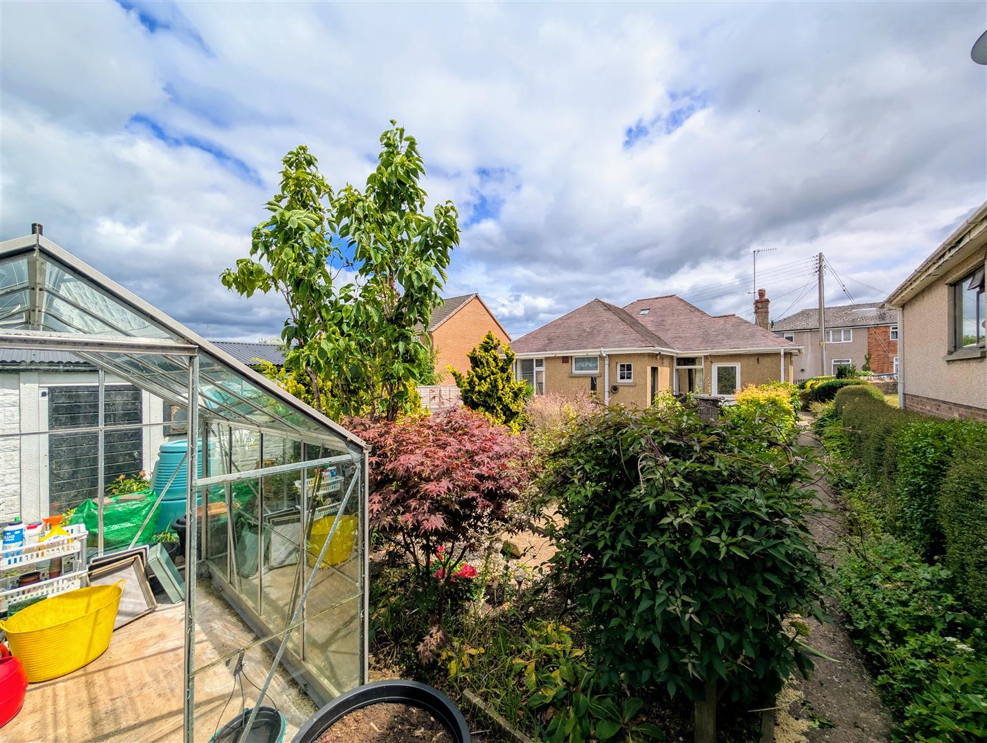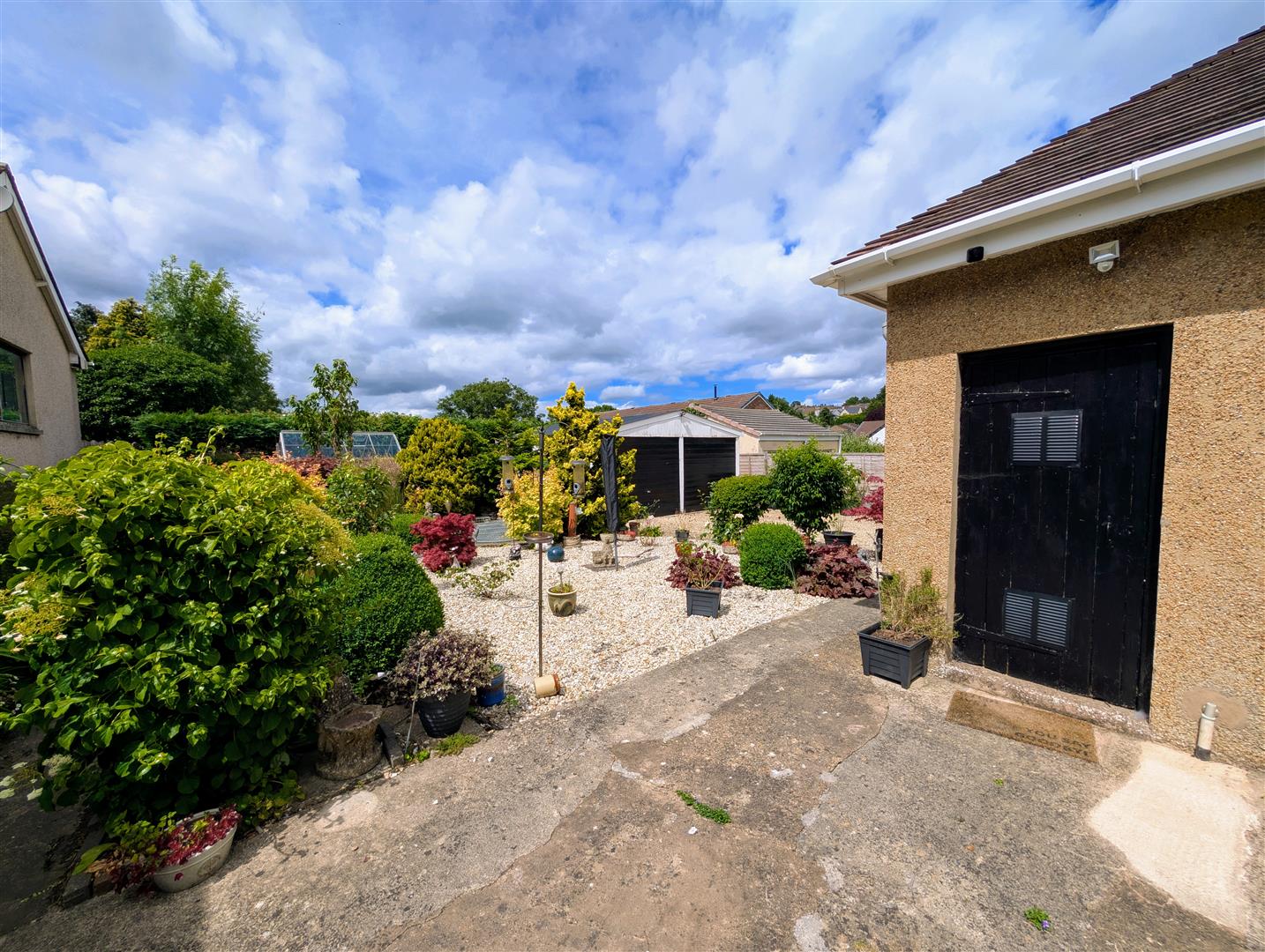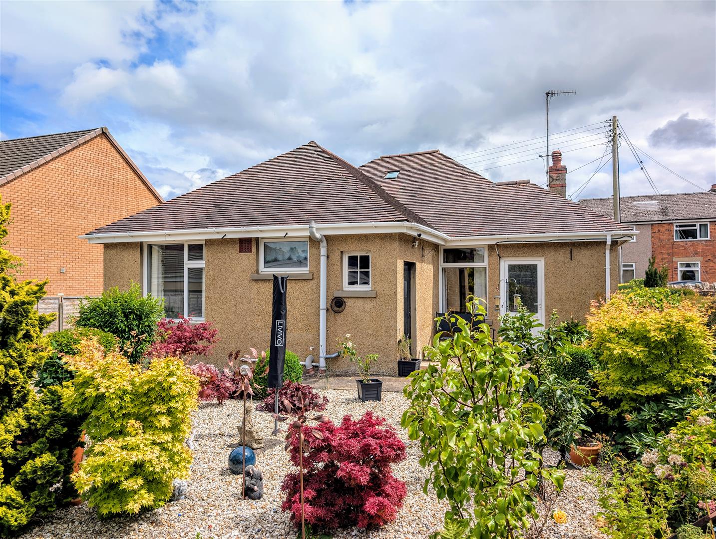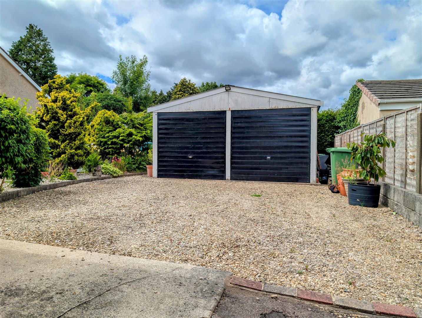 Outside - The property benefits from double gated access onto a tarmac driveway, leading to a gravelled off-road parking area with space for approximately six cars. The front garden is mainly laid to gravel with mature shrubs and bushes, and there's access to the rear garden from both sides of the property, which also leads to the detached garage. The entire plot is fully enclosed by hedging and fencing, offering both privacy and security. A separate door opens into a boiler cupboard housing a Worcester combi boiler, with a radiator, hanging space for drying, and a rear-aspect window.