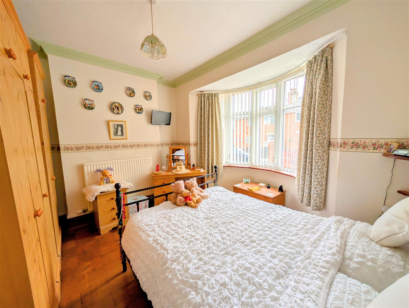 Bedroom One - 3.63m x 2.77m (11'11 x 9'01) - Wooden parquet flooring, radiator, power points, original wooden carved cornice, front aspect double glazed upvc round bay window.