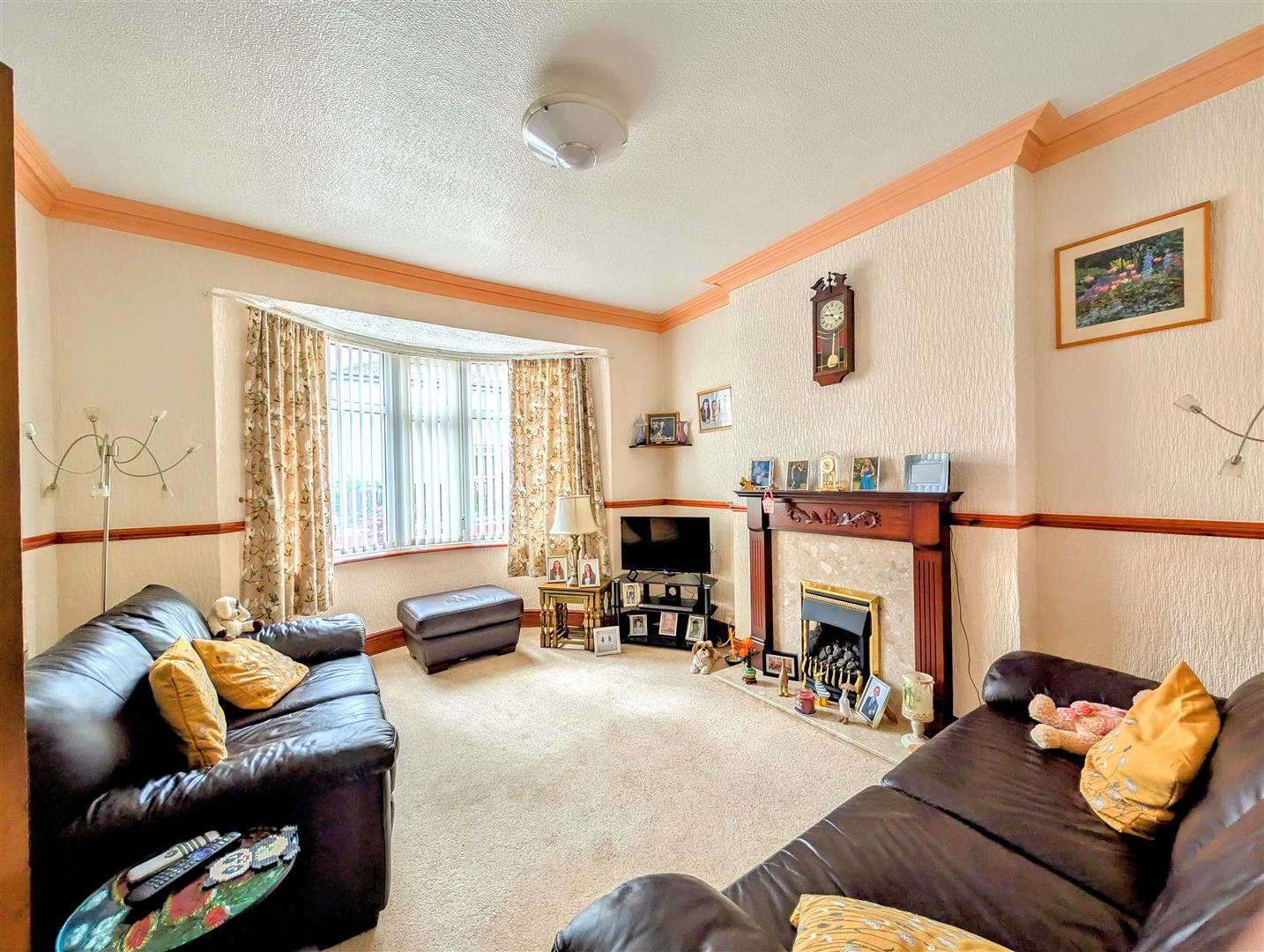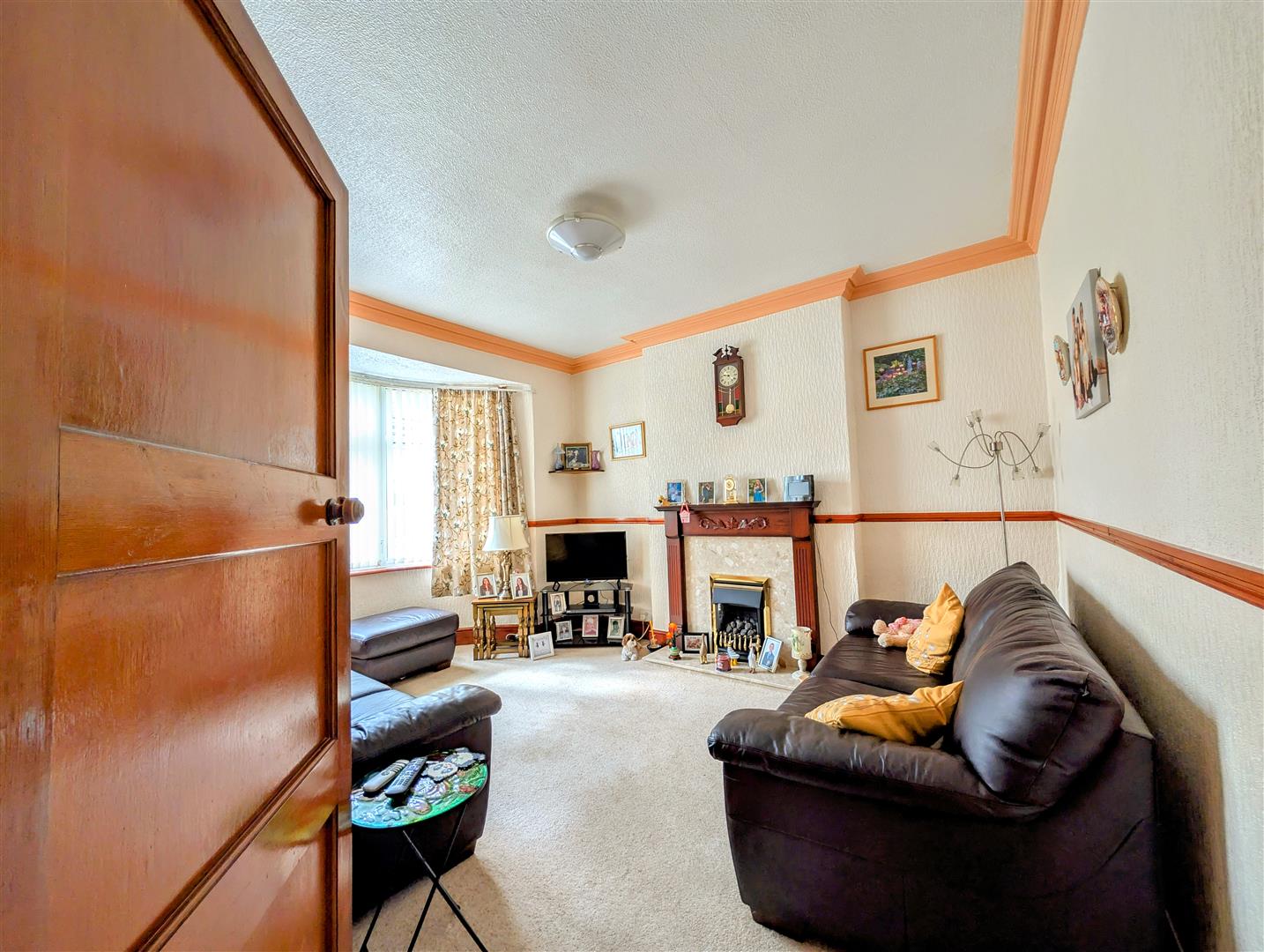 Feature gas living flame fireplace, radiator, power points, tv point, 8'08ft high ceilings, wooden dado rail, wooden carved corner cornice, front aspect double glazed upvc round bay window.