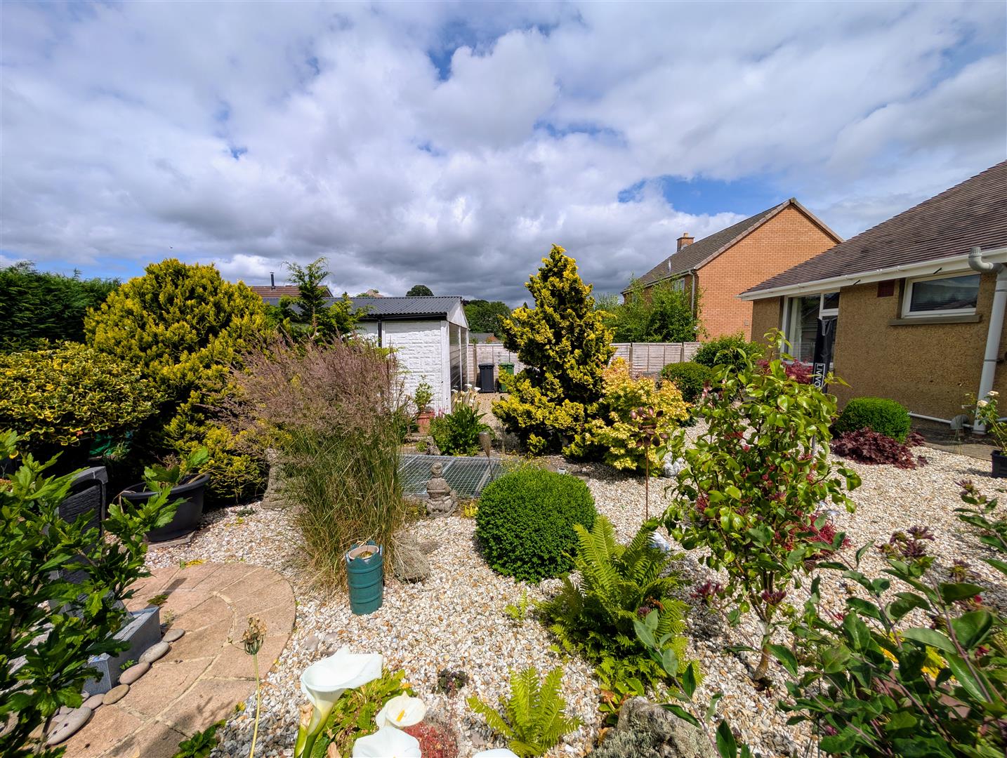 Rear Garden - The rear garden is low maintenance and mostly laid to gravel, complemented by a range of lovely mature shrubs and bushes. There is a central pond with a water feature, and also a greenhouse, along with direct access to the garage.