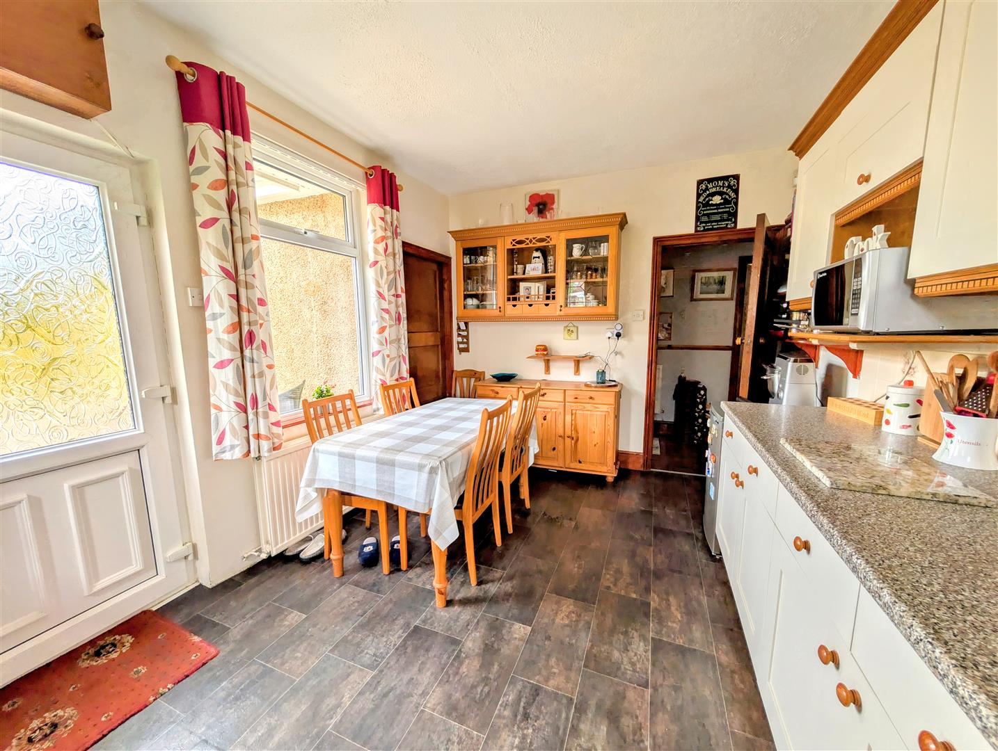 Kitchen - 4.55m x 3.00m (14'11 x 9'10) - Range of wall, drawer and base mounted units, rolled edge worktops, single bowl single drainer sink unit with mixer tap above, space and plumbing for a washing, space for a cooker, space for fridge, space for freezer, part tiled walls, power points, appliance points, radiator, side and rear aspect double glazed upvc windows, rear aspect double glazed upvc frosted door leading out to the garden, door into airing cupboard housing the water tank and has shelving.