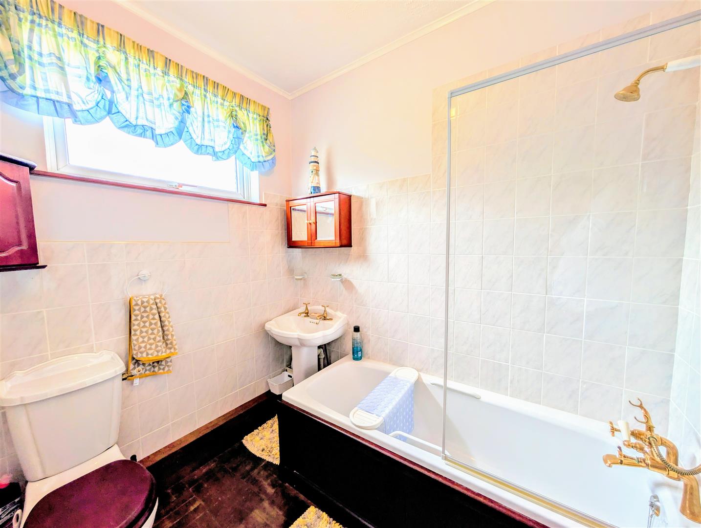 Bathroom - 1.78m x 2.29m (5'10 x 7'06) - White suite comprising of panelled with shower over, pedestal wash hand basin, w.c, parquet flooring, part tiled walls, rear aspect double glazed upvc frosted window.