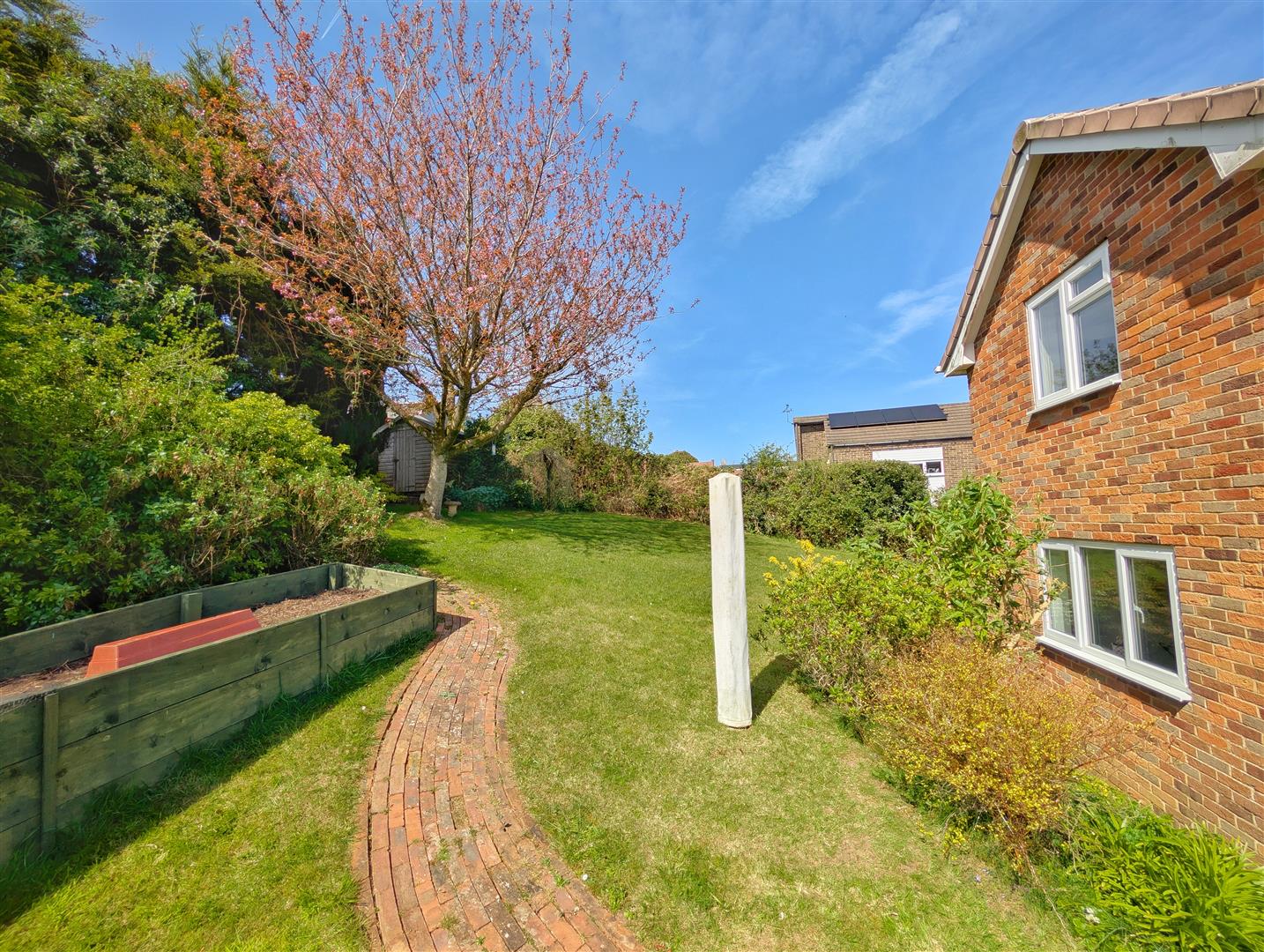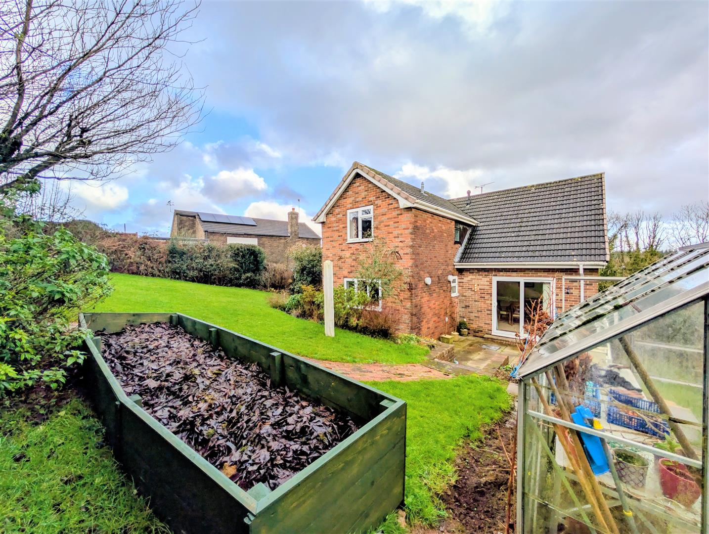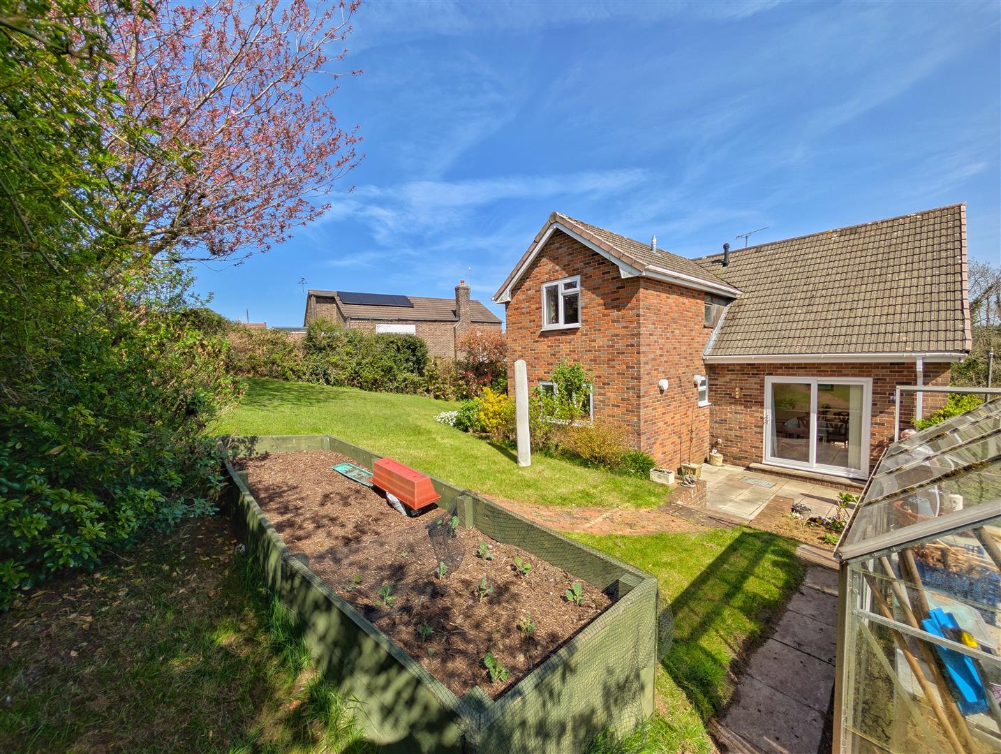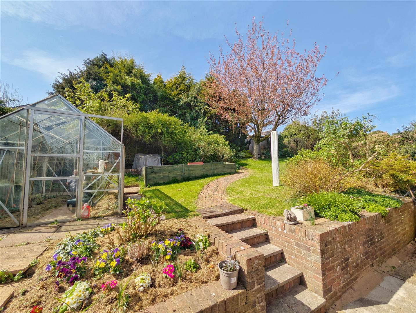 Rear Garden - Mostly laid to lawn with mature shrubs, flowers, trees and bushes, greenhouse, patio/seating area, all enclosed by fencing and hedging surround.