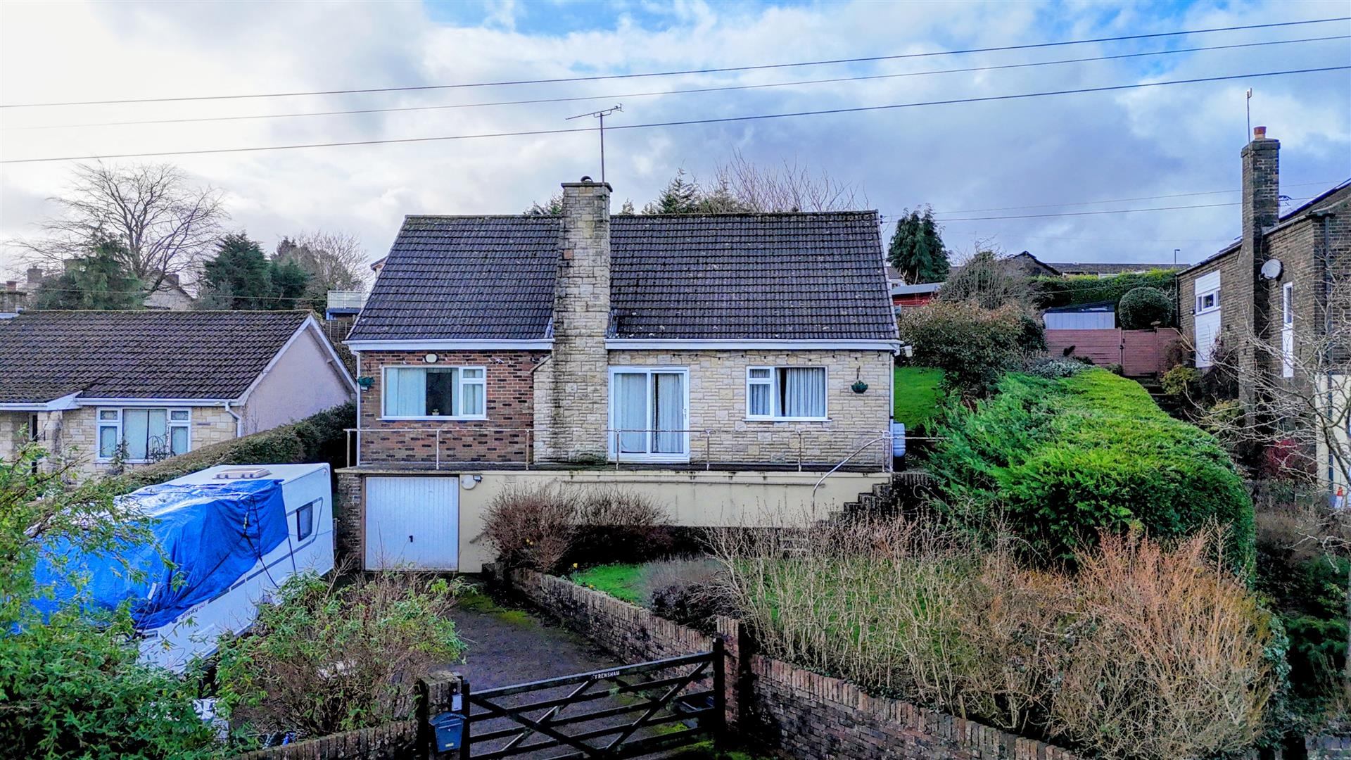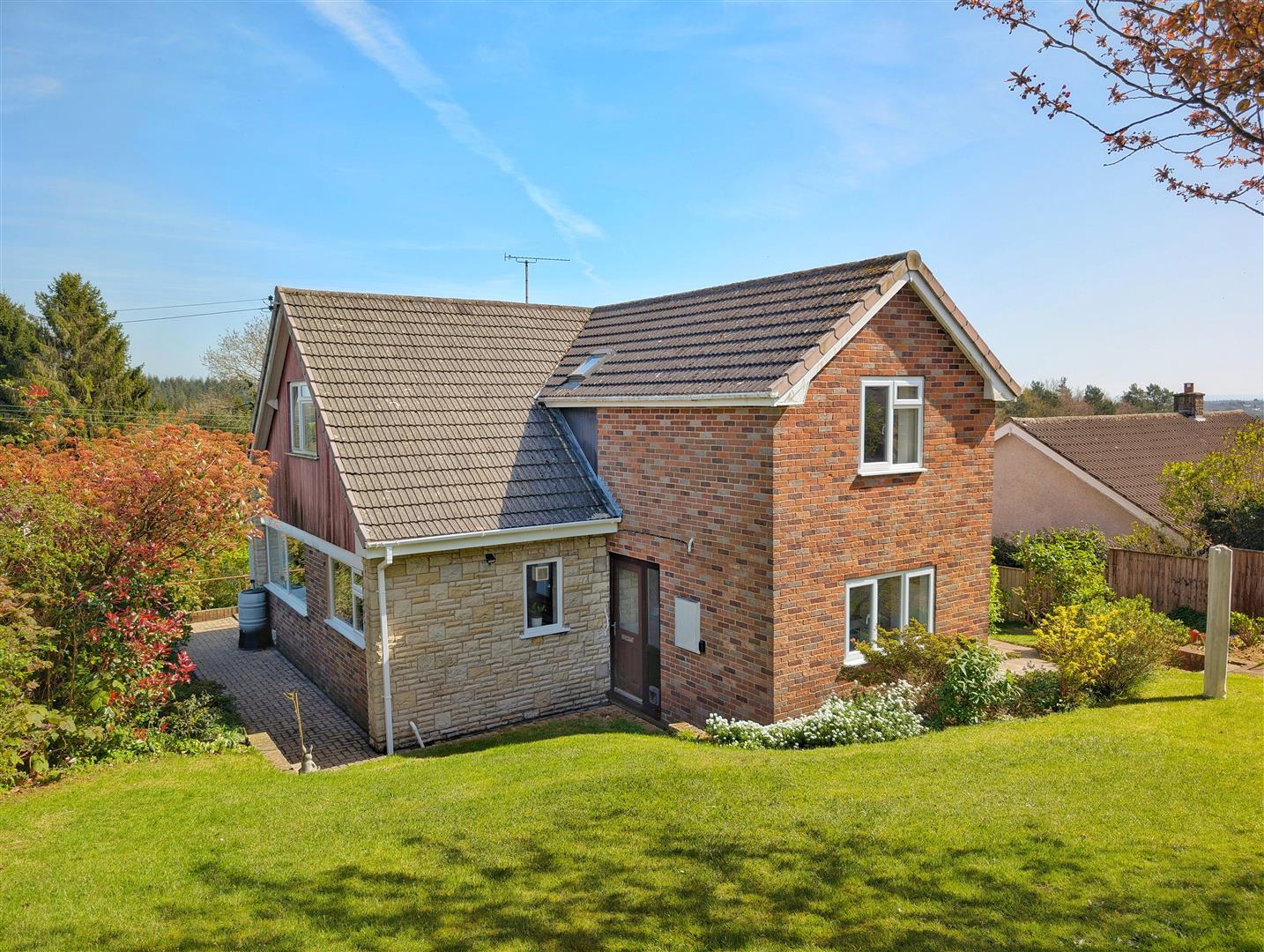 Outside - To the front of the property gated access lead to a parking area suitable for the parking of two/three vehicles which in turn leads to the garage. To the front you also have a raised balcony patio/seating area, lawned area with various shrubs, trees and bushes, far reaching views, pathway leads to the side giving access to the rear.