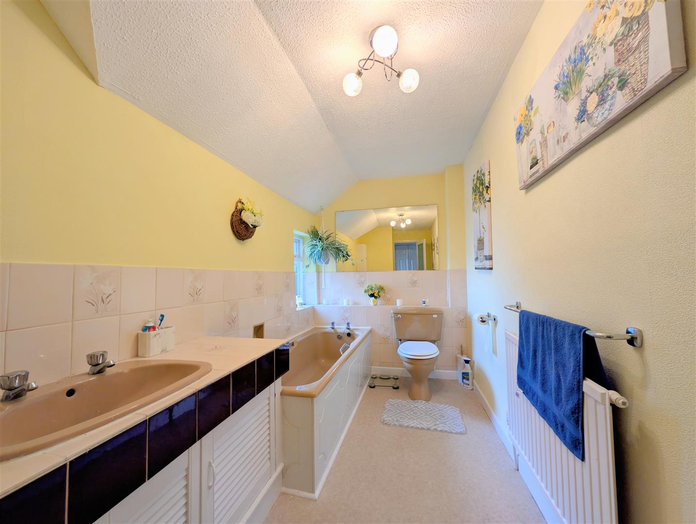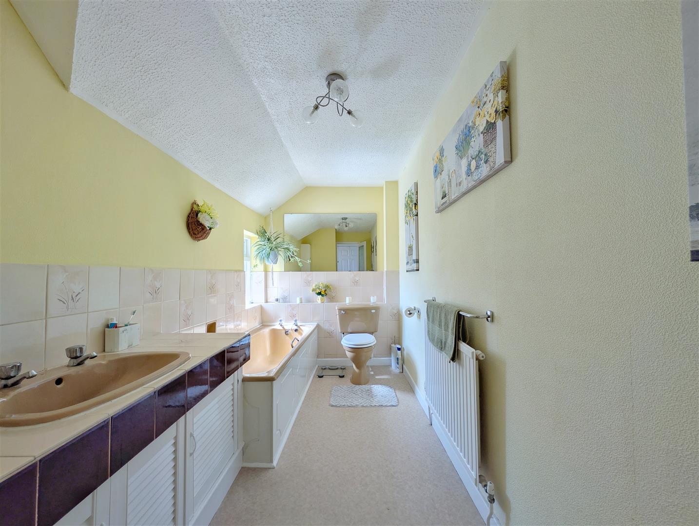 Bathroom - Panelled bath with tiled surrounds, vanity unit with built in wash hand basin, radiator, close coupled W.C, side aspect frosted upvc double glazed window.