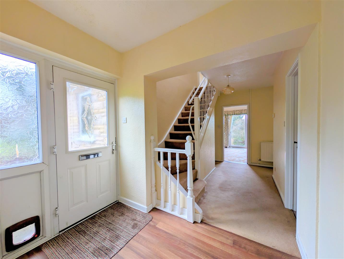 Hallway - Stairs leading to the first floor landing, radiator, storage cupboard with hanging and shelving, understairs storage, double glazed uPVC door to garden. Door into: