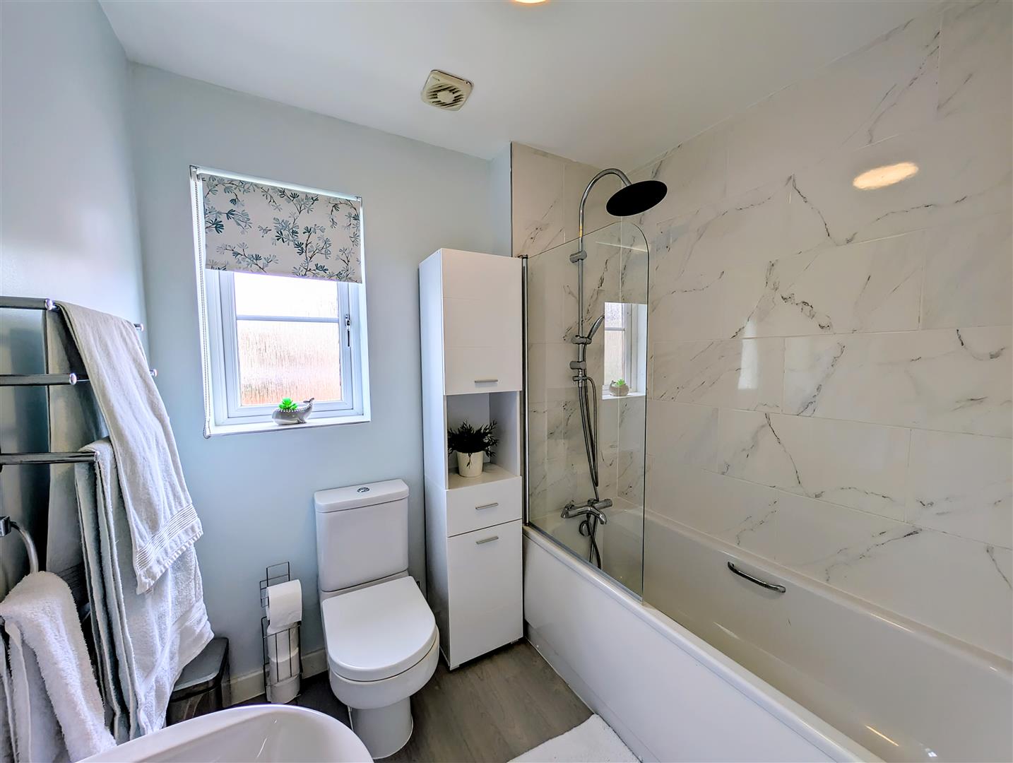 Bathroom - 2.06m x 1.91m (6'09 x 6'03) - Fitted with a white suite comprising panelled bath with shower over, low-level WC and pedestal wash hand basin with tiled splashback. Radiator and front-facing double-glazed uPVC frosted window.