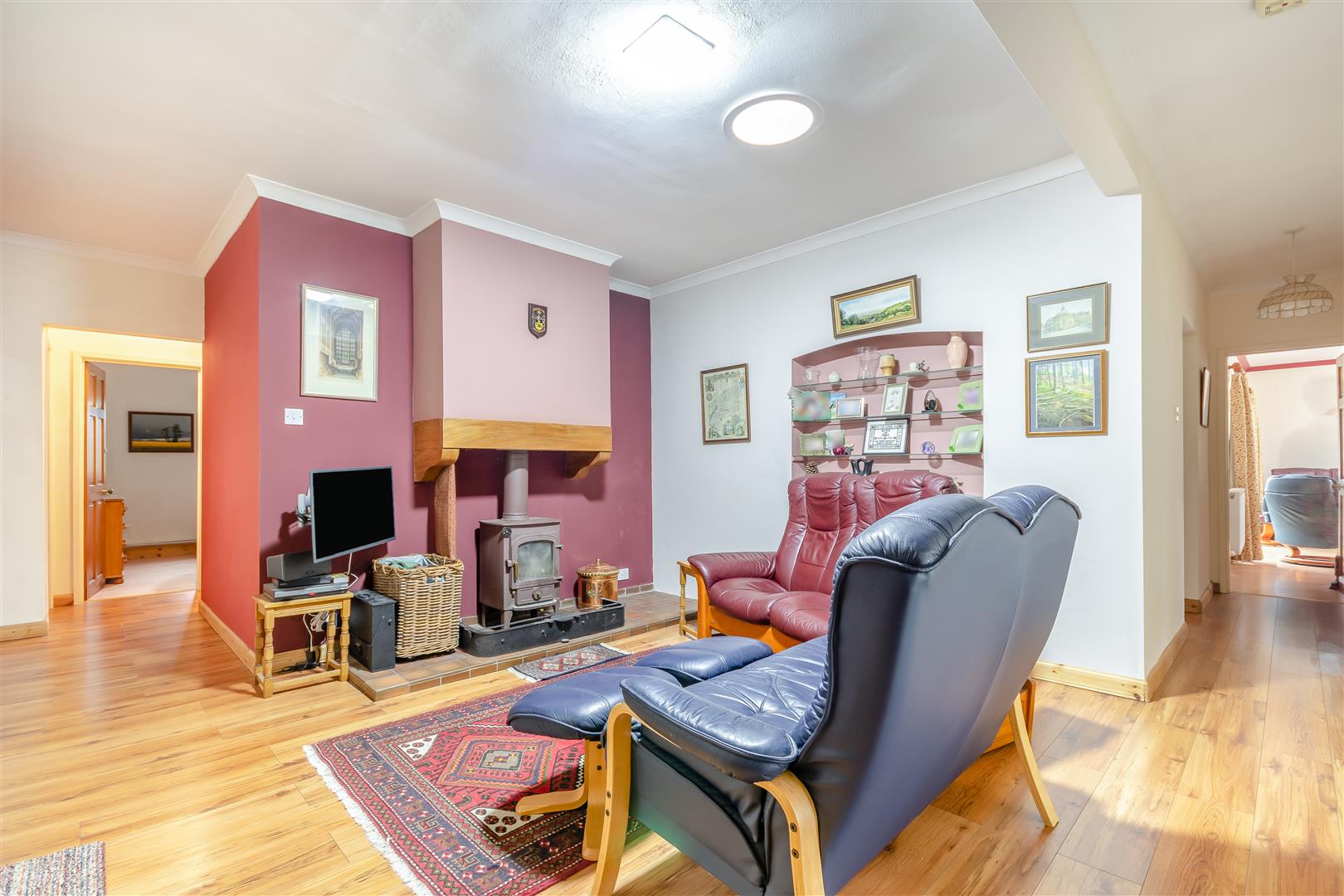 Snug / Spacious Entrance Hall - 4.19m x 3.94m (13'9 x 12'11) - Wood burning stove with raised tiled hearth, double radiator, light tube, airing cupboard with slatted shelving, access to roof space.