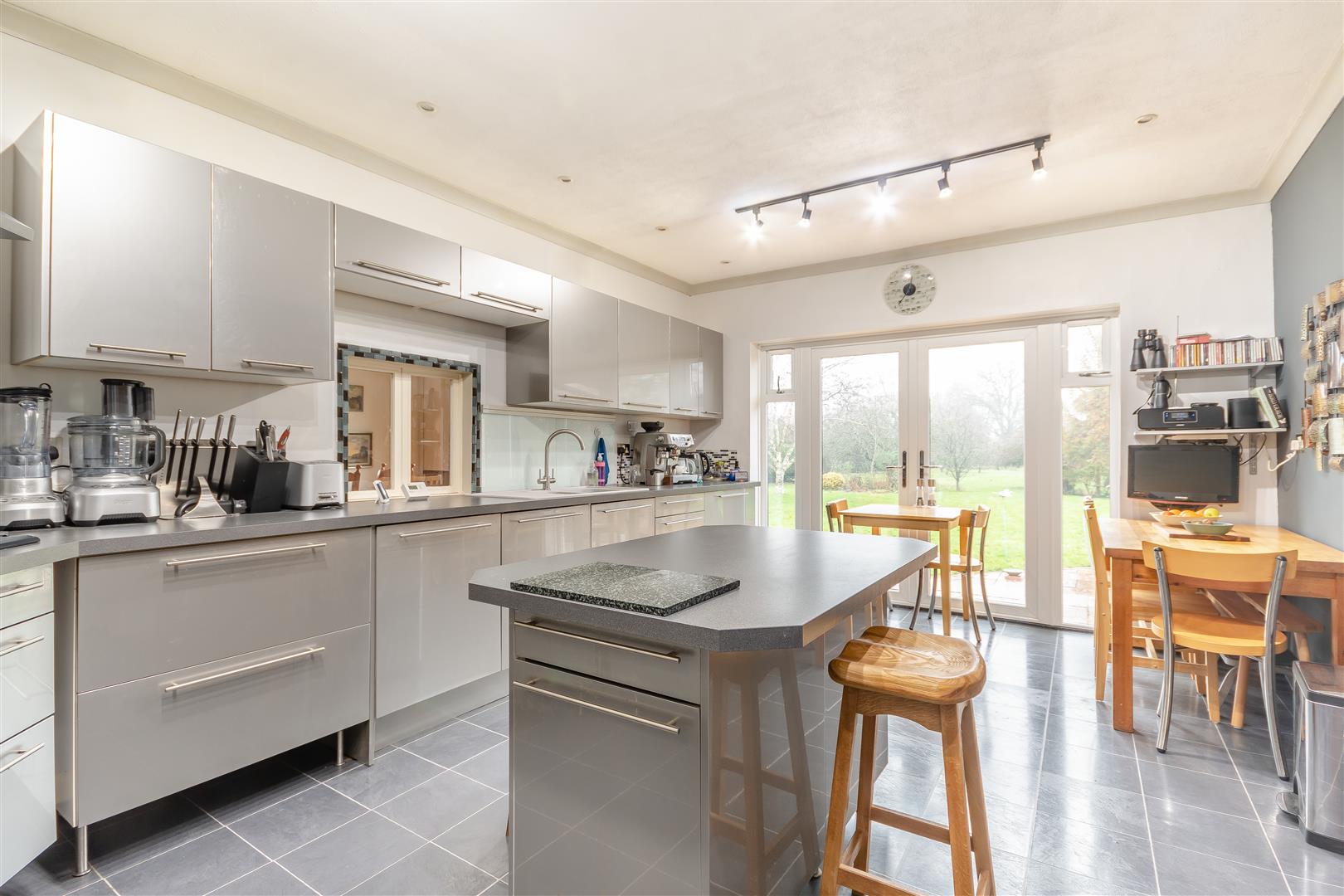 Kitchen - 5.23m x 3.61m (17'2 x 11'10) - Fitted kitchen to comprise one and a half bowl single drainer sink unit with mixer tap, cupboard under, range of base and wall mounted units, central breakfast island, integrated appliances to include dishwasher, under counter fridge, five ring gas hob with cooker hood above, electric double oven, laminate flooring, radiator, UPVC double glazed patio doors through to the rear with a lovely unspoilt outlook over the gardens and grounds.