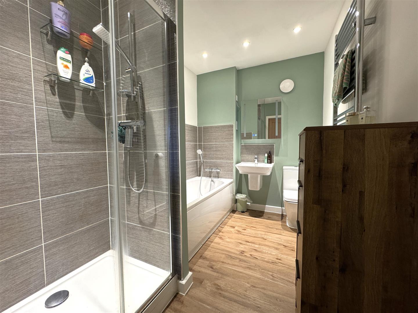 Bathroom - 2.90m x 2.01m (9'6 x 6'7) - Suite comprising panelled bath with mixer tap and shower detachment, walk-in shower cubicle with inset detachable overhead shower, fully tiled walls, WC, wash hand basin with mixer tap, medicine cabinet with light, shaver point, extractor fan, chrome heated towel rail.