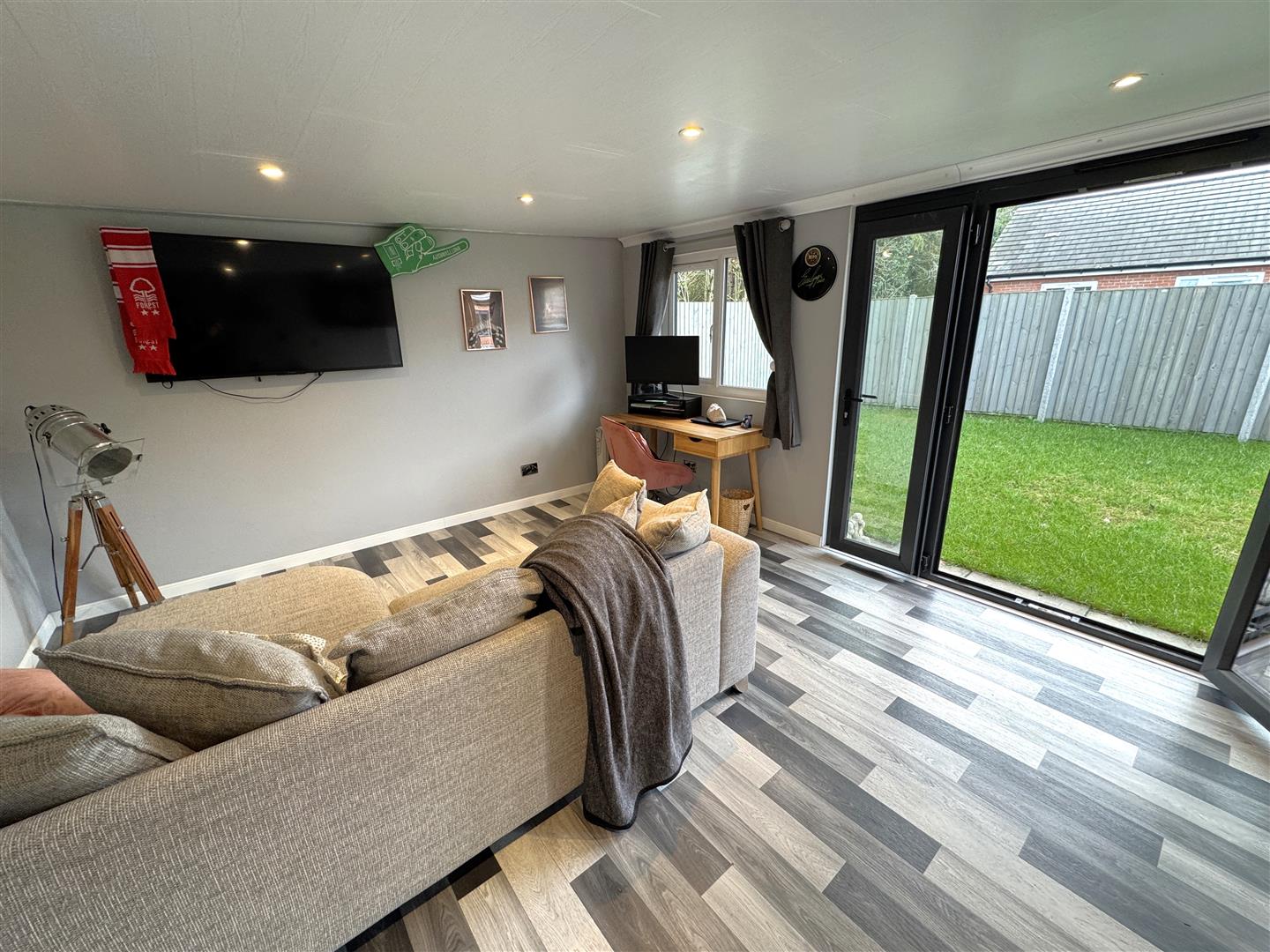Home Office / Summer House - 4.83m x 3.78m (15'10 x 12'5) - Laminate flooring, power and lighting, inset spotlighting, bar area with built-in units and counter fridge storage, front and side aspect windows, side aspect patio doors.
