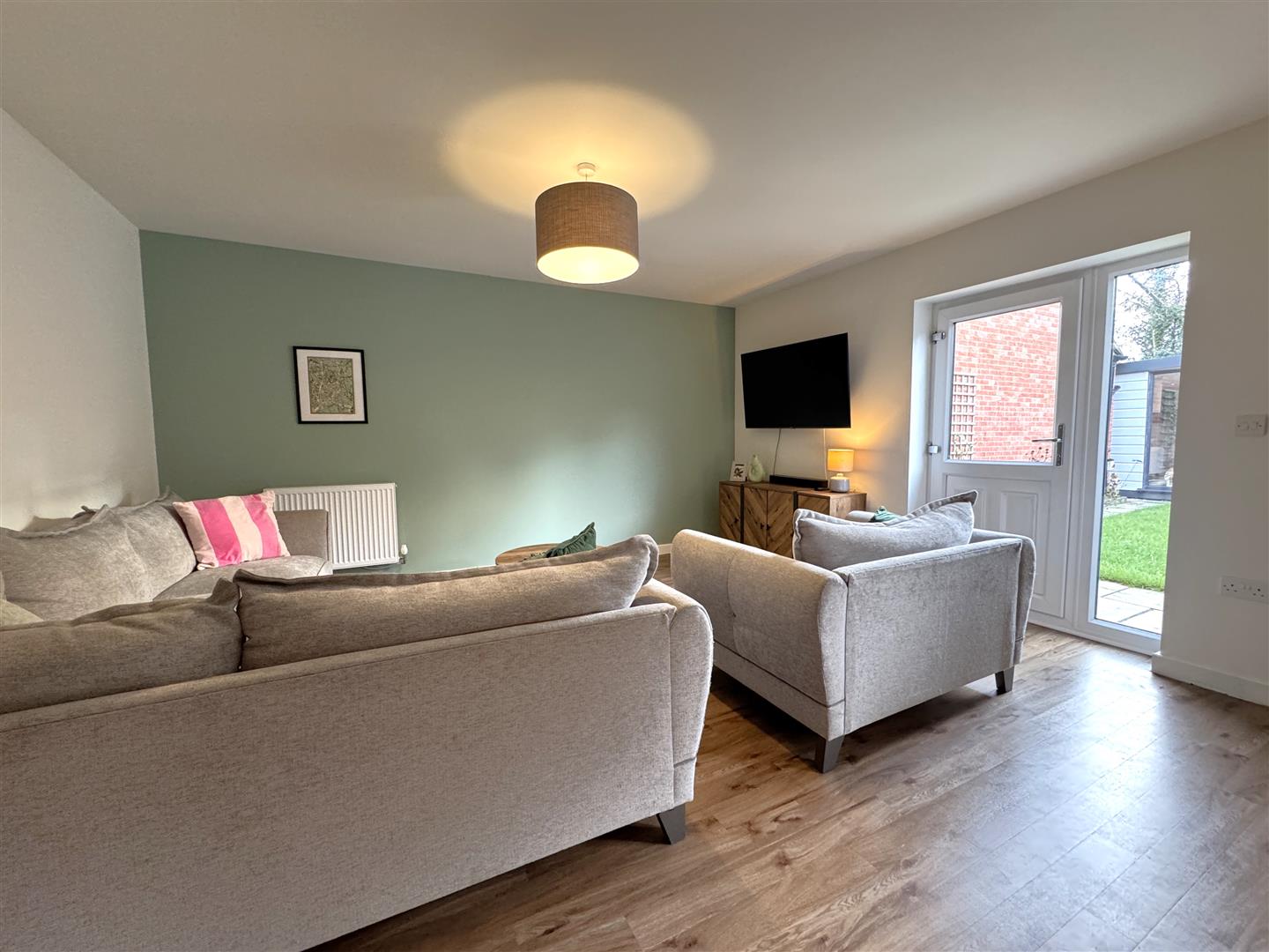 Lounge area with double radiator, thermostat control, TV network points, rear aspect full length window and half glazed door to the gardens.