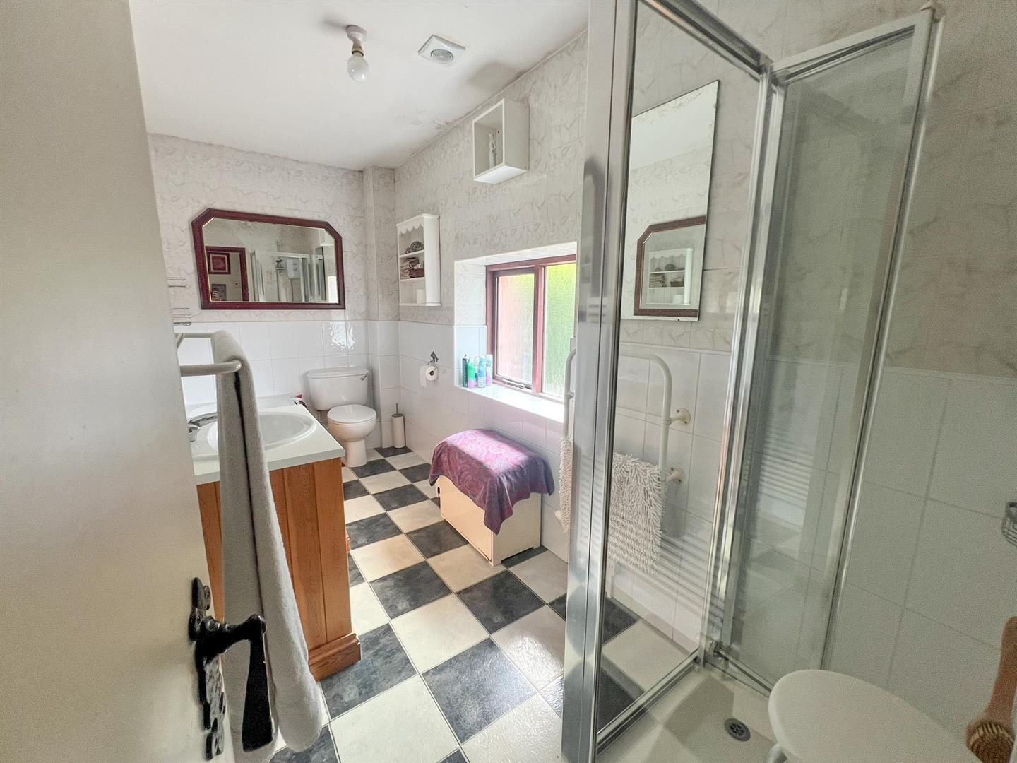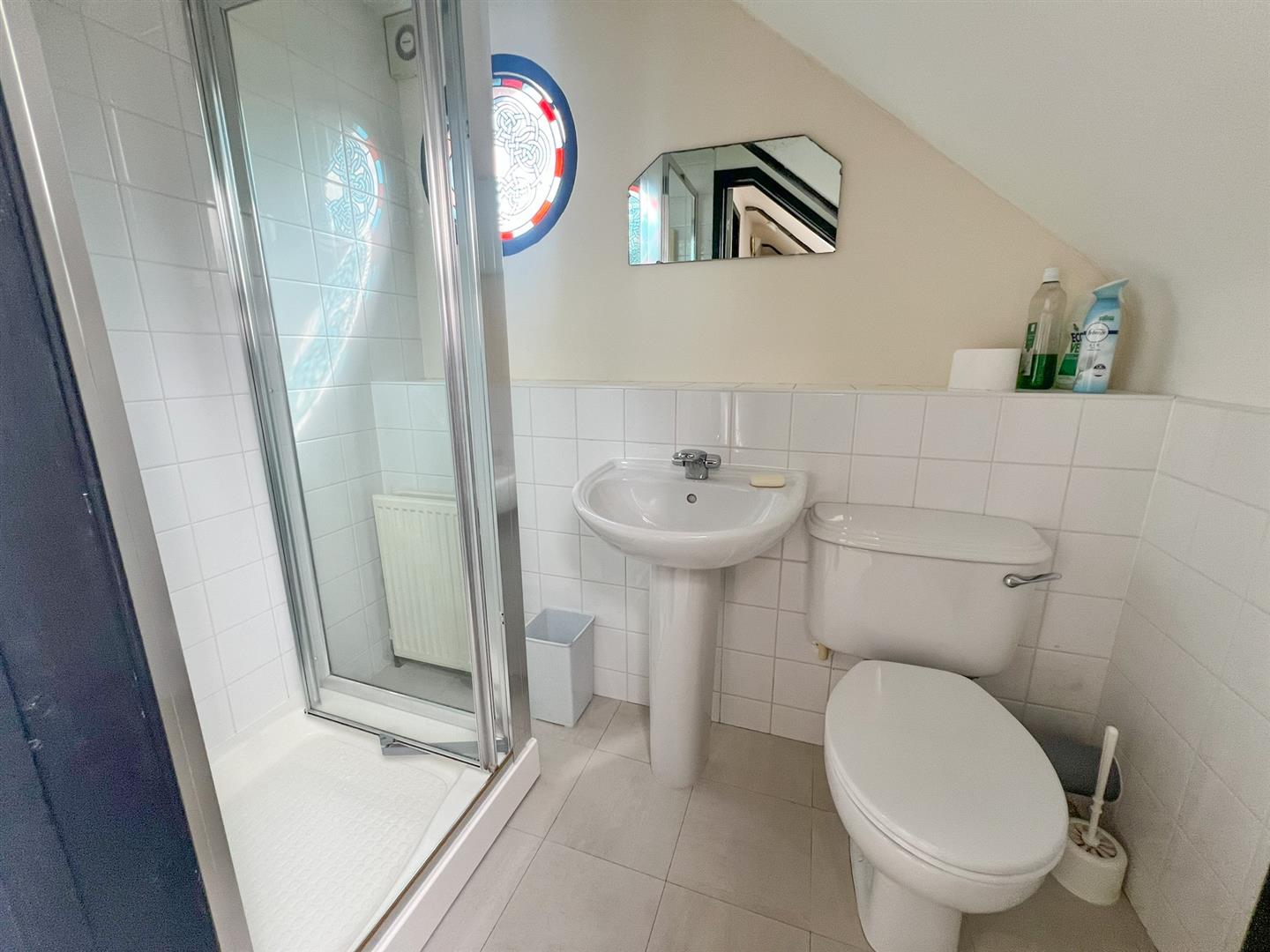 Shower Room - White suite with pedestal wash hand basin, taps over, close coupled w.c, shower cubicle with electric shower fitted, ceiling light, extractor fan, exposed ceiling and wall timbers, half tiled walls, double radiator, side aspect obscure glazed window.
