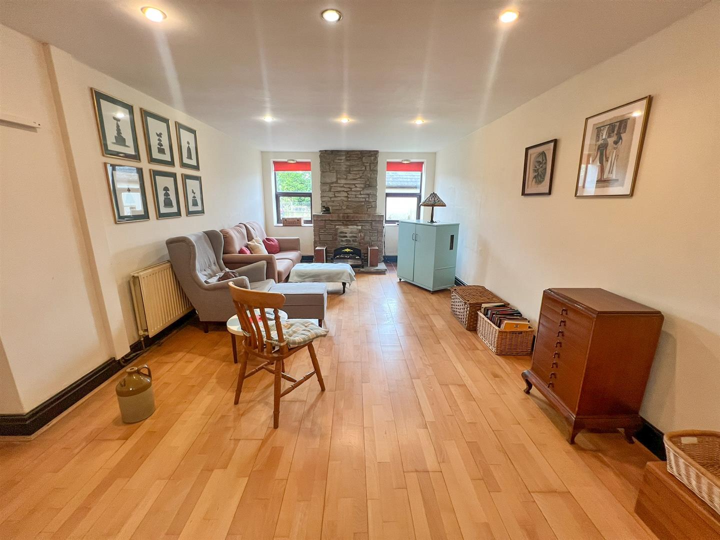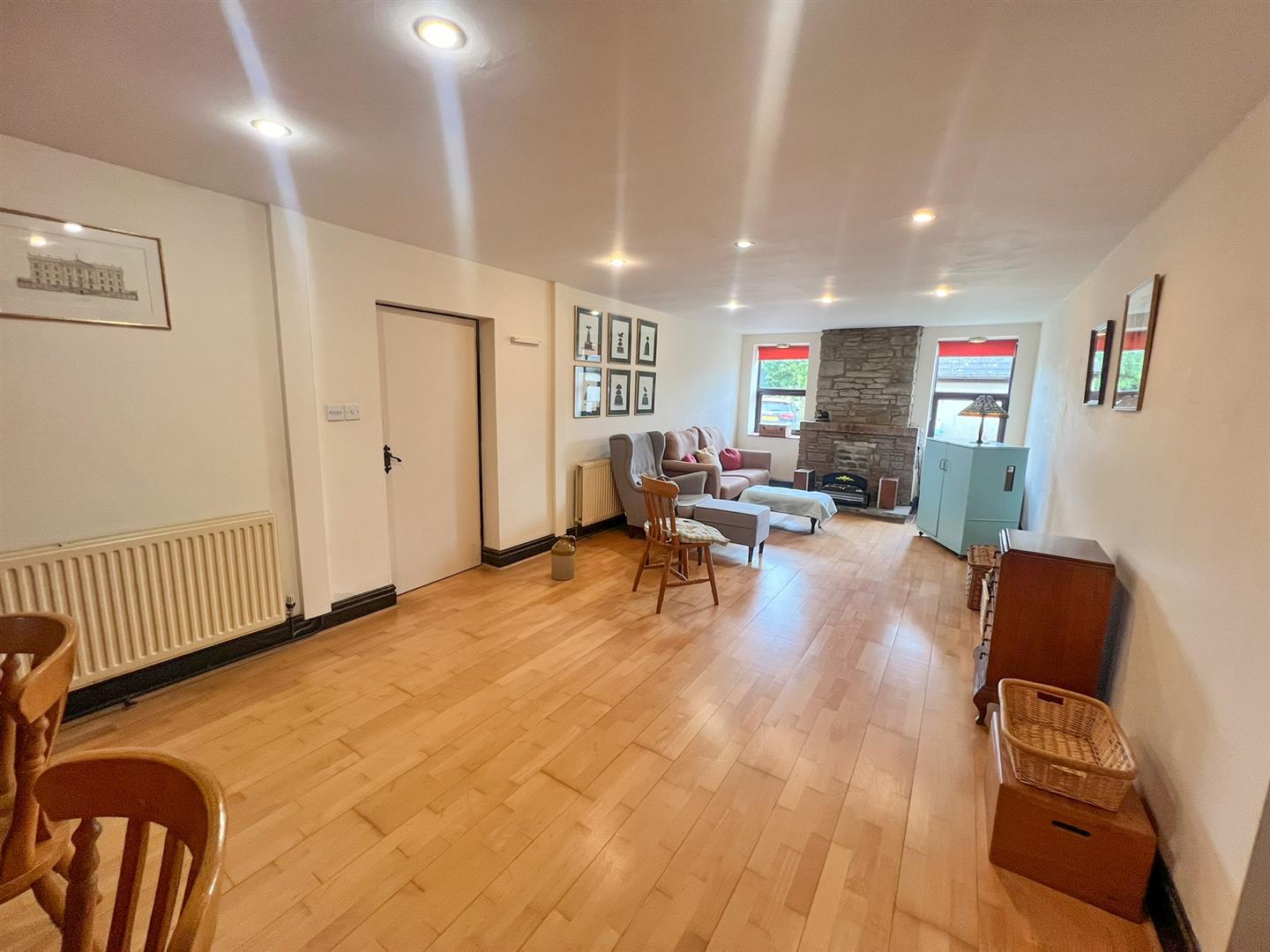 Lounge - 8.56m x 3.66m (28'01 x 12'00) - Inset ceiling spots, stone and brick constructed feature fireplace, double glazed window to either side, quarry tiled and wood laminate flooring, power points, tv point's, two double radiators, feature brick and stone alcoves with shelving space and lighting inset, pair of double glazed French doors opening into: