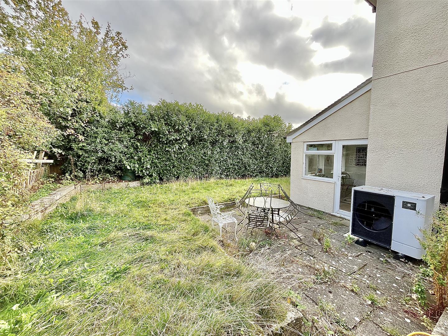 The private enclosed rear garden is mostly laid to lawn with small patio, air source heat pump.