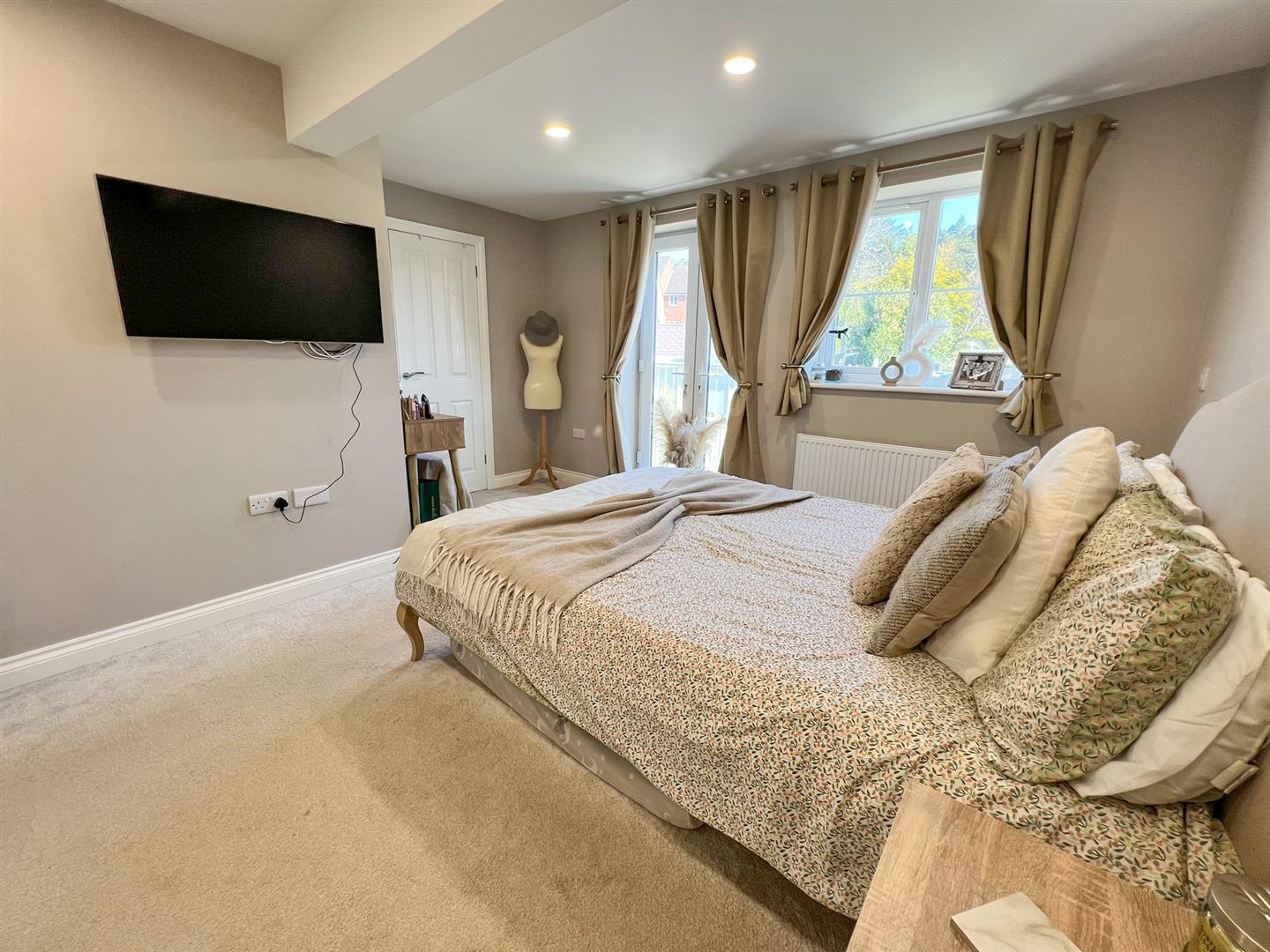 Bedroom One - 4.17m x 4.14m max (13'08 x 13'07 max) - Inset ceiling spots, range of built in wardrobes with hanging rail and shelving space, power points, usb points, single radiator, rear aspect upvc double glazed doors giving access onto a Juliette style balcony, rear aspect upvc double glazed window overlooking the rear garden with views towards forest and woodland, wooden panel door giving access into: