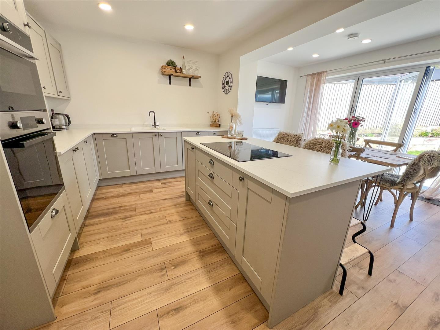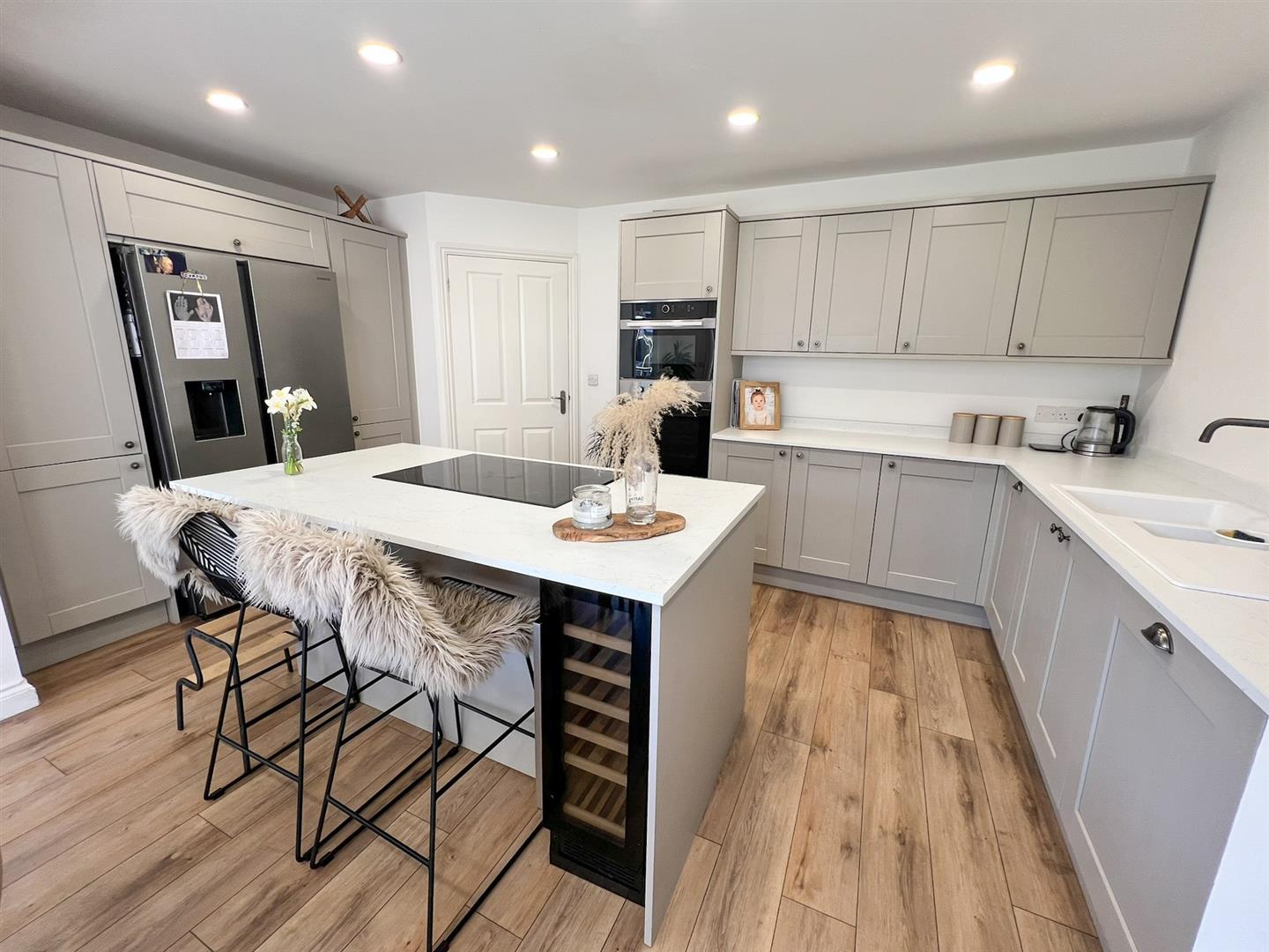 Kitchen - 4.78m x 2.92m (15'08 x 9'07) - One and a half bowl single drainer sink unit with mixer tap over, square edge worktops with matching upstands, range of base and wall mounted units, integrated dishwasher, concealed bin storage, five ring induction hob, space for American style fridge/freezer, wine cooler, island unit, wood laminate flooring, inset ceiling spots, built-in double oven with microwave, opening into: