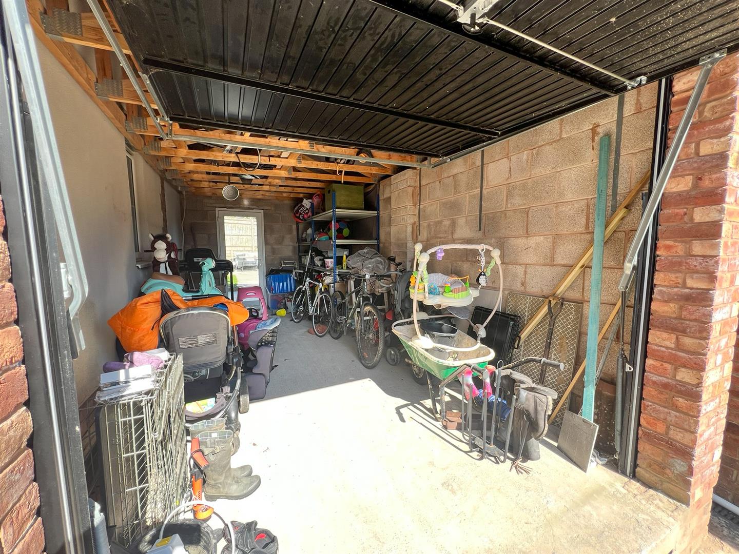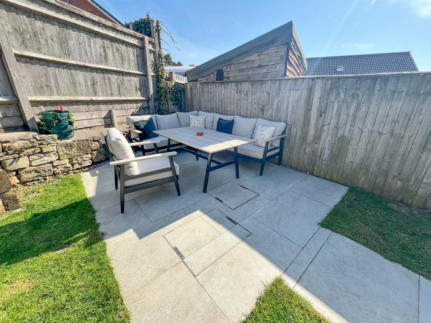 The rear garden is laid to patio and lawn, providing various areas for entertaining. Raised flower borders are planted with shrubs and bushes, all enclosed by fencing. Additional benefits include outside lighting, an outside tap, and rear access to the garage via a personal door.