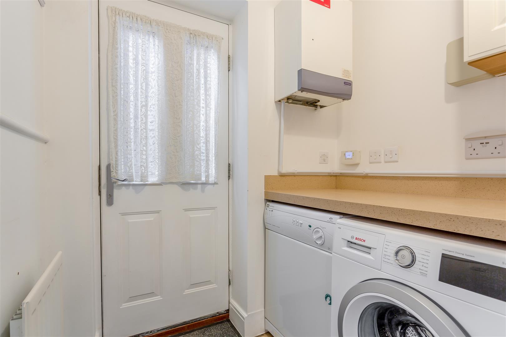 Utility - Matching Quartz worktop with space and plumbing below for a washing machine and tumble dryer, wall mounted gas-fired boiler, radiator, tiled floor, side aspect composite door.