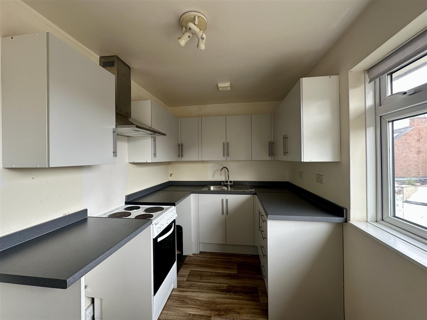 Kitchen - 3.63m x 2.13m (11'10" x 6'11" ) - Modern light grey kitchen with a range of base, drawer and wall mounted units, roll edge worksurface, single drainer stainless steel single sink with a mixer tap, space for fridge, plumbing for washing machine, space for a table, space for an electric oven, extractor hood, upvc double glazed window to side elevation.