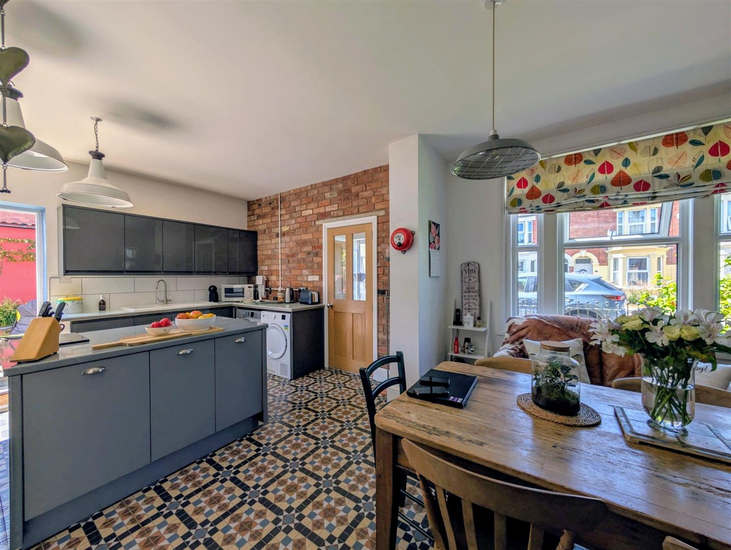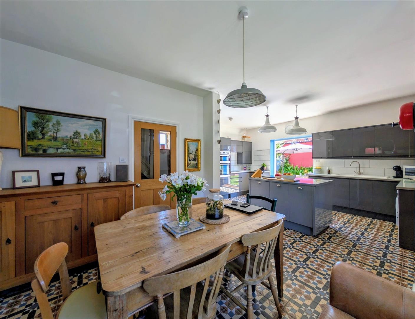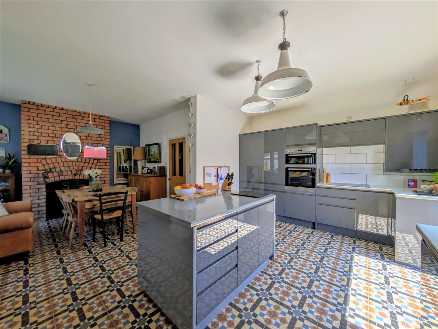 Kitchen/Diner/Family Room - 6.86m x 5.05m max (22'6 x 16'7 max) - A range of base and wall mounted units, worktops, tiled splashbacks, single drainer one and a half bowl sink unit with a mixer tap, built in electric double oven, induction hob and extractor hood, plumbing for automatic washing machine, built in dishwasher, built in fridge and freezer, Island unit with drawers and cupboards, space for a large table and chairs, exposed red brick chimney breast, ornate tiled floor, traditional style radiator, upvc double glazed window to side elevation, matching French doors to rear elevation onto the patio.