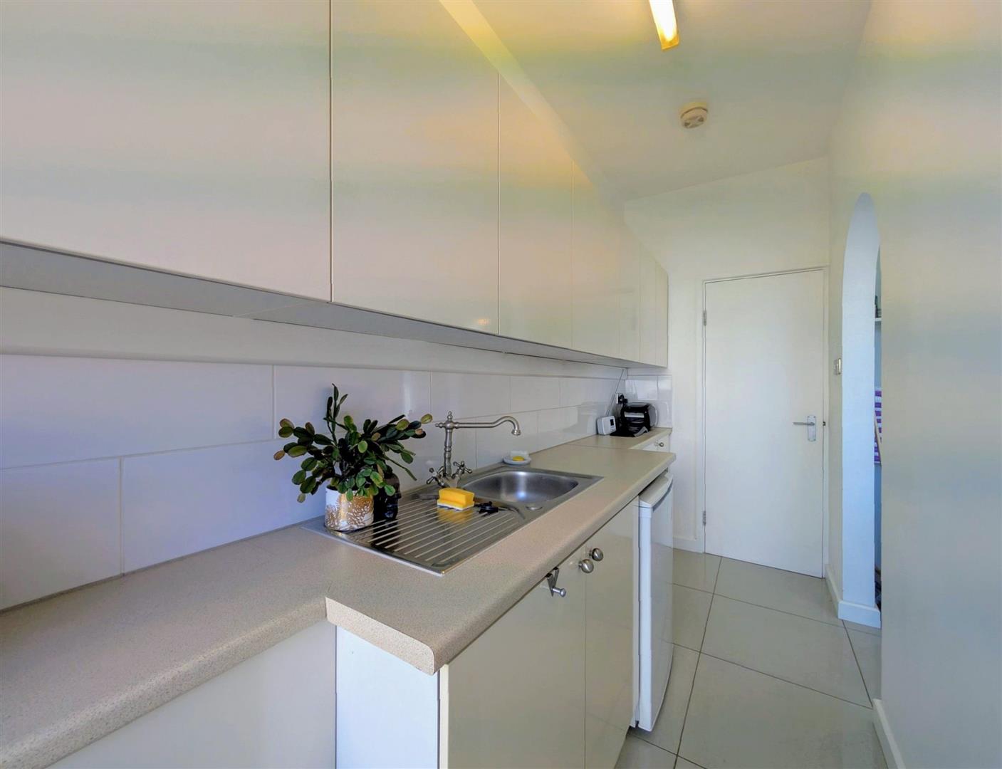 Shop's Kitchen - 3.68m x 1.30m (12'1 x 4'3) - Base and wall mounted units, laminated worktops, single drainer stainless steel sink unit with a mixer tap, High Gloss tiled floor, partially glazed door to front elevation, through to:
