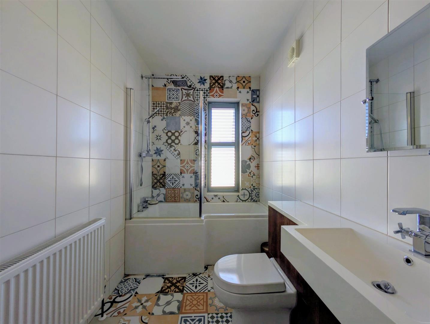 Bathroom - 2.79m x 1.68m (9'2 x 5'6) - White suite comprising shower bath with a mixer tap and shower unit over, low level w.c., wash hand basin with a mixer tap and cupboards below, tiled floor, fully tiled walls, single radiator, extractor fan, upvc double glazed window to front elevation.