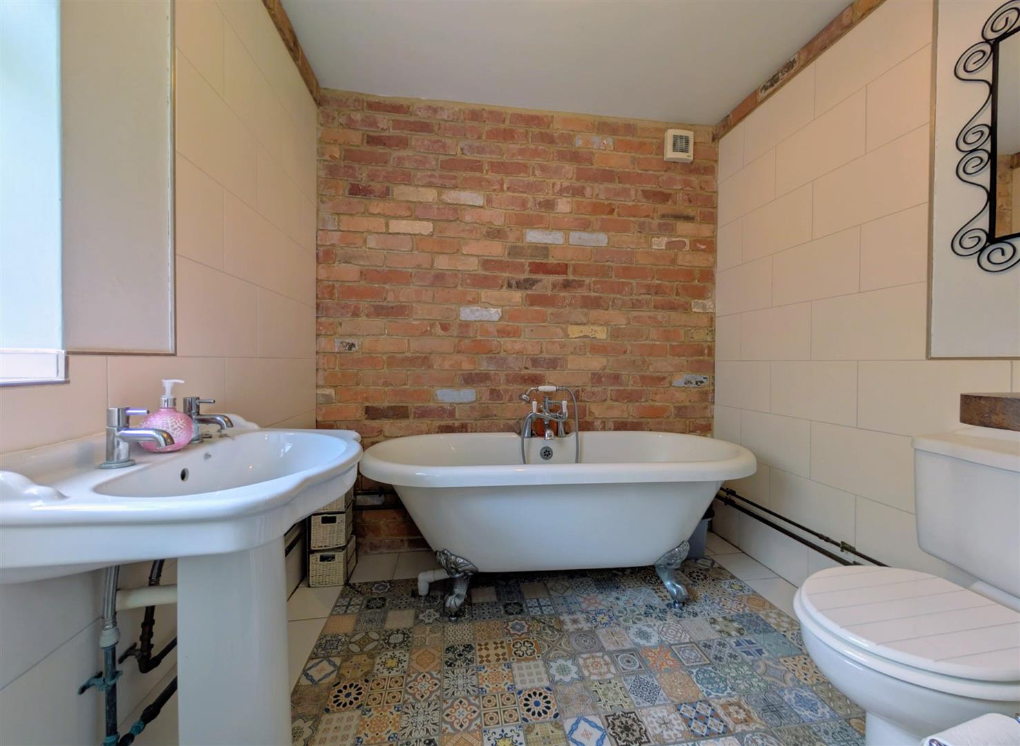 Bathroom - 2.16m x 1.85m (7'1 x 6'1) - White suite comprising of a roll top ball and claw bath with a mixer tap and showerhead attachment, low level w.c., pedestal wash hand basin, exposed red brick walling, tiled floor, extractor fan, double radiator, upvc double glazed window to side elevation.