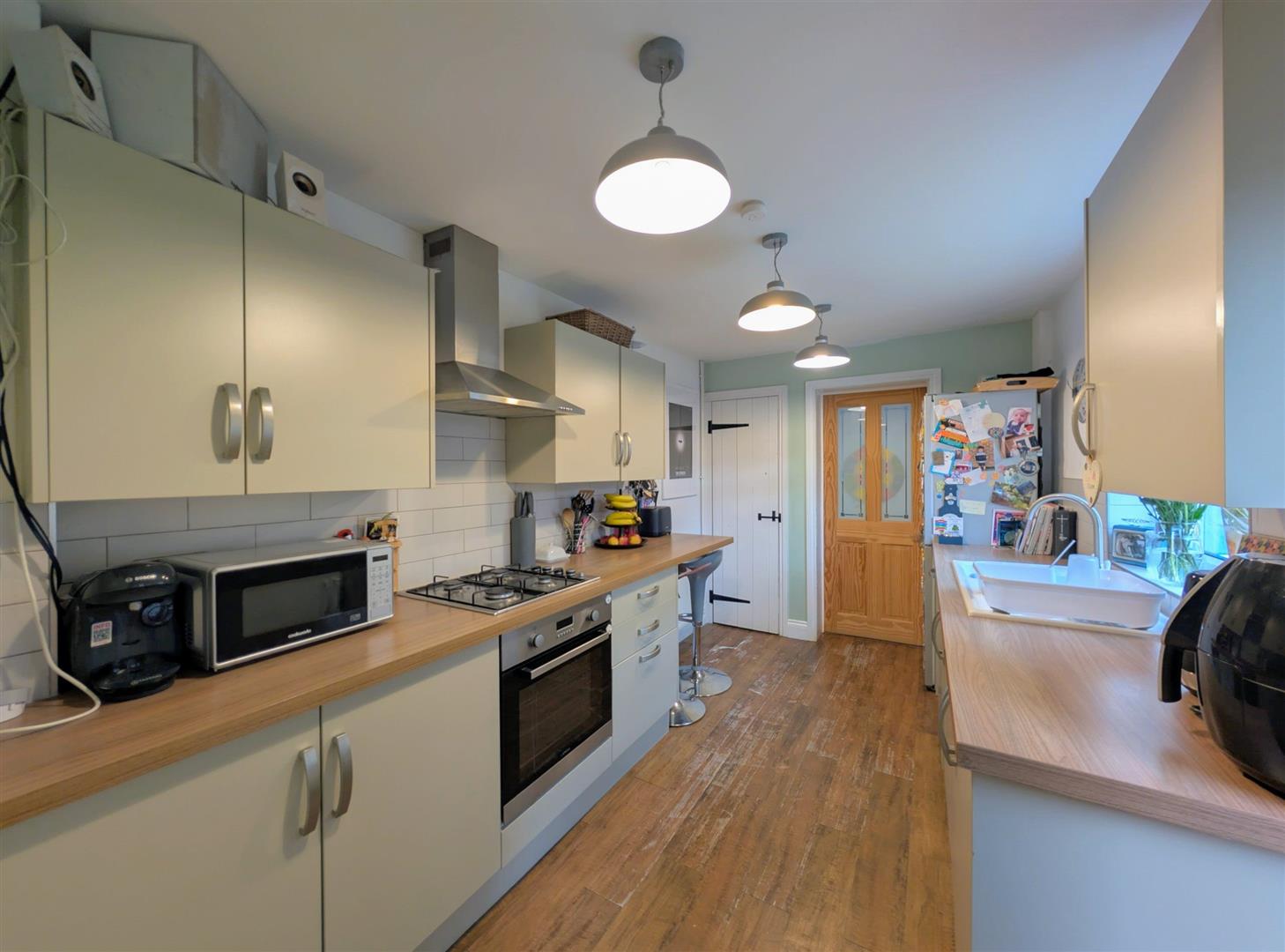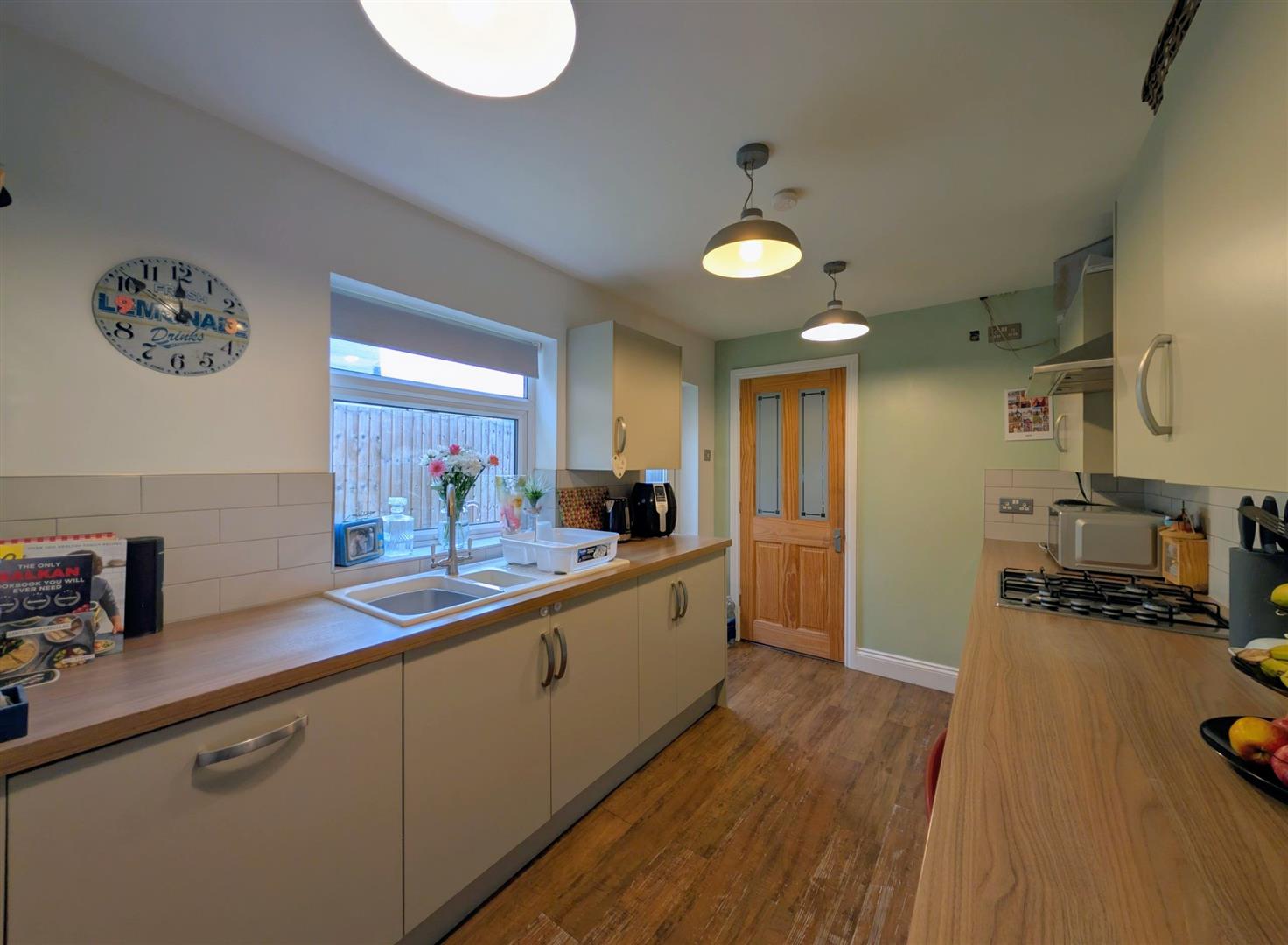 Kitchen - 3.99m x 2.31m (13'1 x 7'7) - Modern base and wall mounted units, laminated worktops, tiled splashbacks, single drainer one and a half bowl sink unit with a mixer tap, built in electric oven, four burner gas hob and extractor hood, built in dishwasher, space for fridge/freezer, double radiator, understairs storage cupboard, upvc double glazed window and door to side elevation.