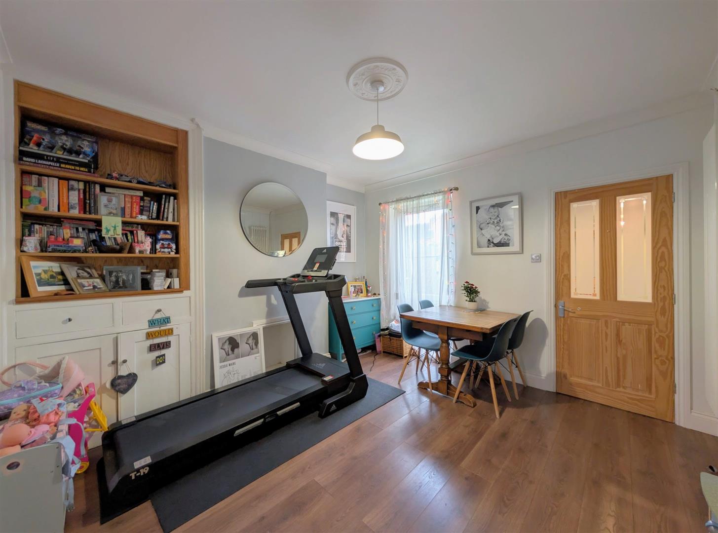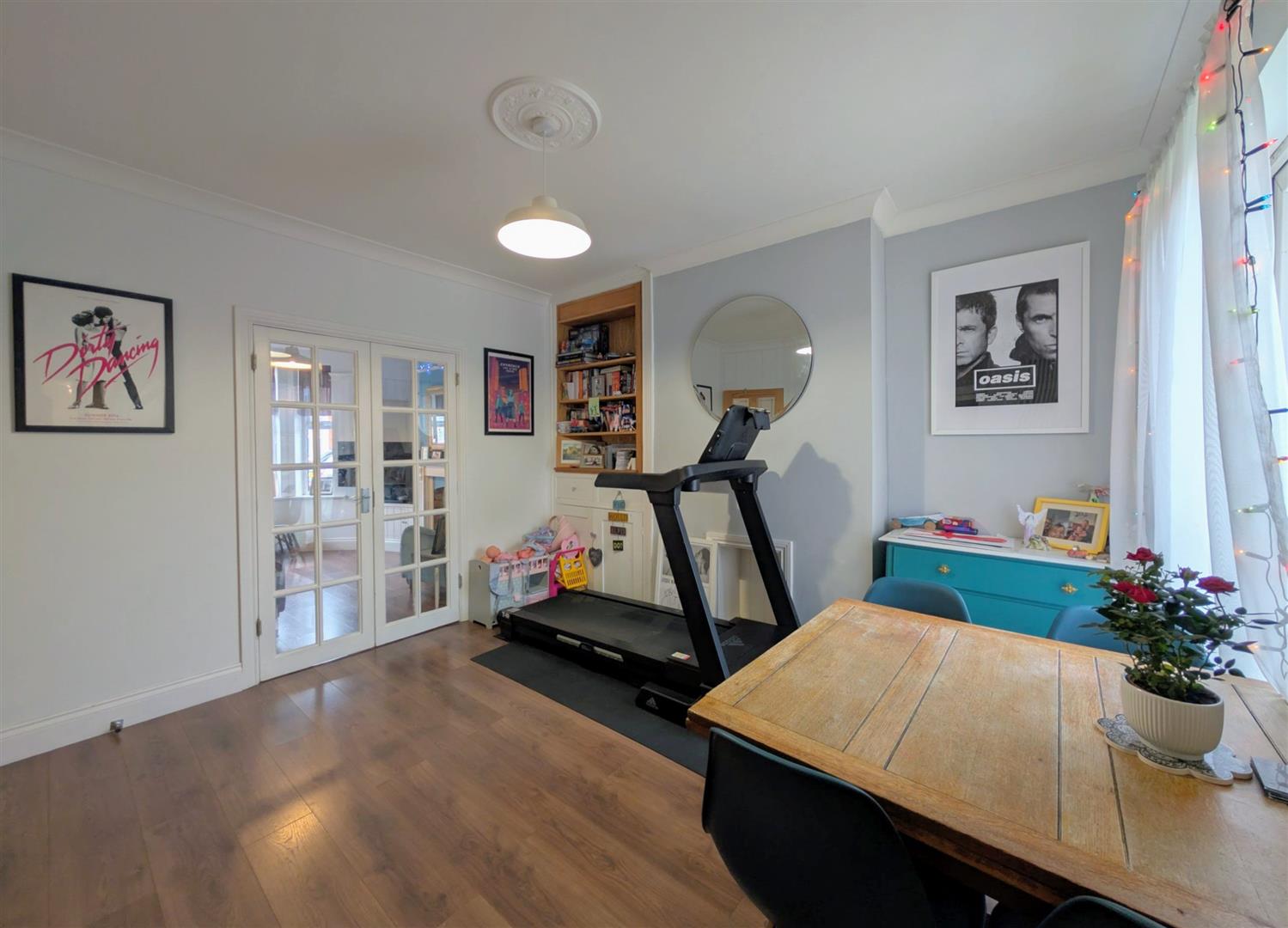 Dining Room - 3.66m x 3.51m max (12' x 11'6 max) - Laminate flooring, built in storage cupboards, vertical radiator, coved ceiling, upvc double glazed door to rear elevation onto the garden, double doors into: