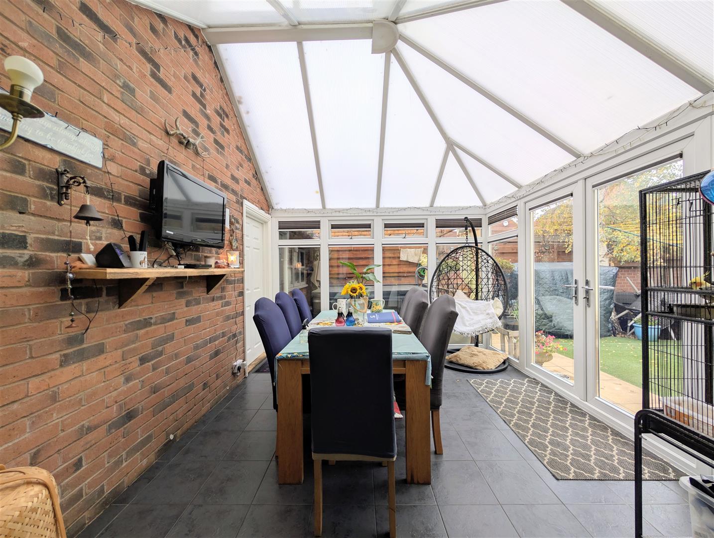 Conservatory - 3.71m x 3.35m (12'2 x 11') - Upvc double glazed construction with a polycarbonate roof, French door to side elevation, tiled floor, wall lights, double radiator, personal access into the garage.